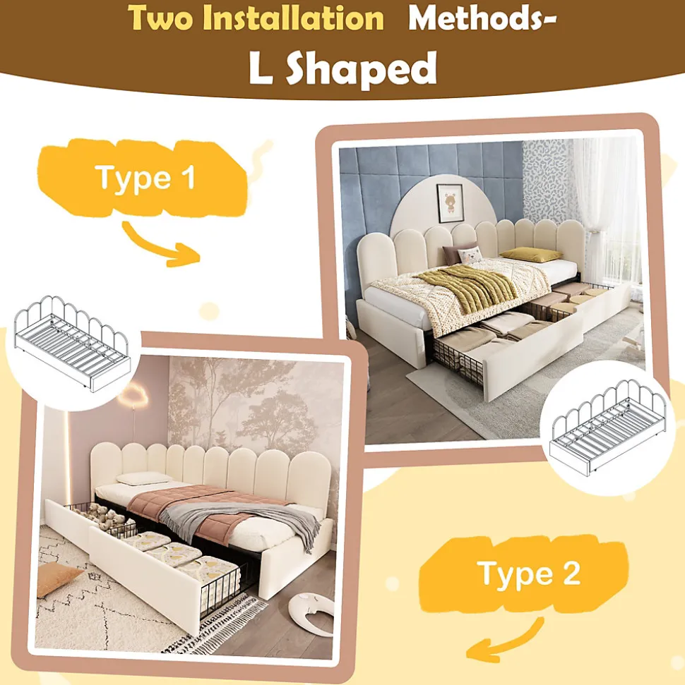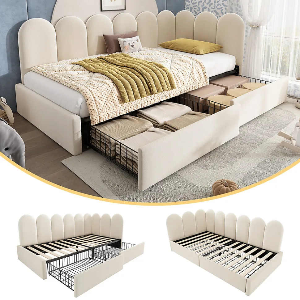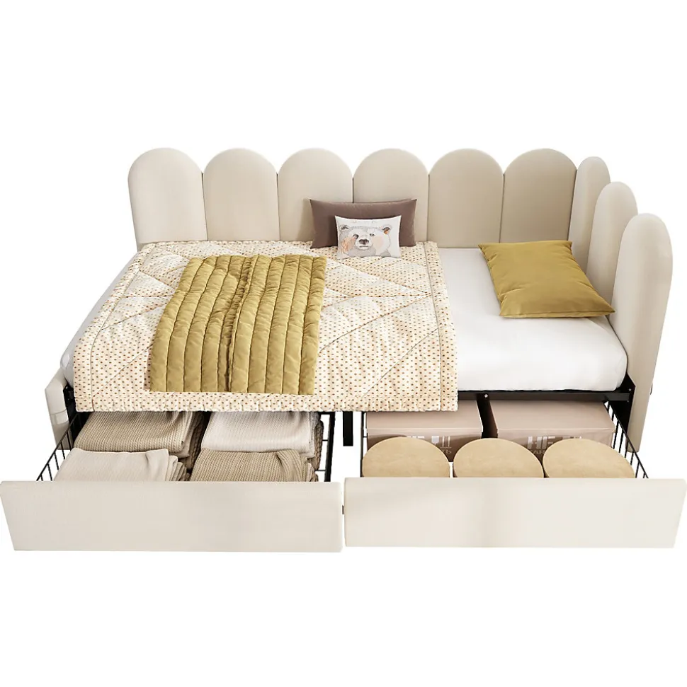 ▶ ▶ Détails ▶────────────────● Type de produit : Lit banquette● Couleur : Beige● Matériau : Velours● Dimensions totales : 199 × 94 × 76 cm (L × l × H)● Dimensions du couchage : 90 × 190 cm● Matelas : Non inclus● Charge maximale supportée : 136 kg● Contenu : Cadre de lit avec tiroirs de rangement● Dimensions intérieures des tiroirs : 73,5 × 50 × 15 cm● Nombre de colis : 2● Montage requis : Oui► Remarques ►※ Les dimensions sont mesurées manuellement et peuvent présenter une variation de 2 à 3 cm.※ Des différences de couleur peuvent apparaître selon la lumière ou les paramètres d’affichage.※ Le produit est livré en 2 colis, susceptibles d’être livrés séparément.