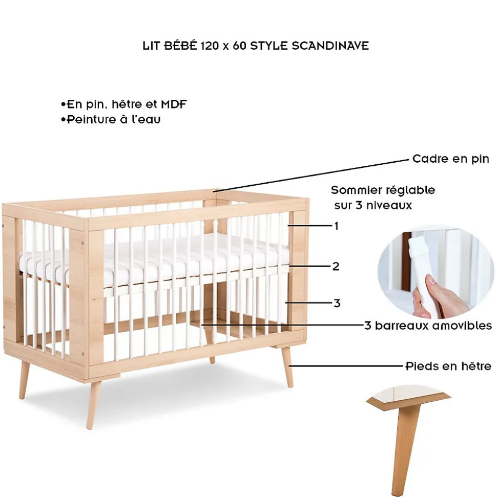 SOFIE Lit bébé à barreaux avec sommier réglable Dès la naissance. Plusieurs modèles disponibles. CARACTÉRISTIQUES : Ce lit, de style scandinave, associe la pureté du blanc à l’authenticité du bois. La hauteur du sommier se modifie au gré de la croissance de l’enfant. 3 barreaux amovibles sur un côté permettent à l’enfant d’entrer et de sortir seul de son lit, quand il est en âge de le faire. Ce lit est fabriqué en pin et MDF. Ses pieds sont en hêtre. Fabrication Européenne. Peinture à l’eau. À monter. Matelas non inclus. DIMENSIONS ET POIDS : Dimensions extérieures du lit : L 124 cm x l 66 cm x H 88 cm Dimensions intérieures du lit : L 120 cm x l 60 cm Poids total : 24 kg. À NOTER : pas de livraison en Corse ou sur les îles.
