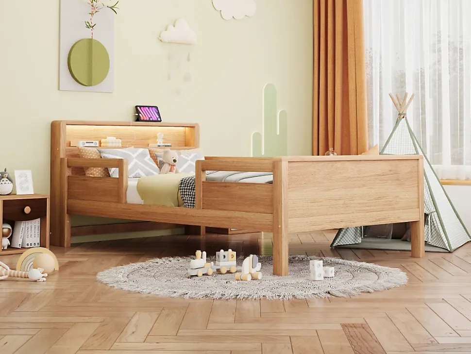 Équipé d’une lampe LED et d’un port de charge multifonctionÉquipé d’une lampe LED et d’un port de charge multifonction USB et Type-C, permettant de recharger différents appareils pendant les moments de repos ou d’étude tout en profitant d’une lumière douce.Tête de lit avec espace de rangementLa tête de lit de ce lit simple en bois comprend un compartiment pratique pour ranger appareils électroniques, montres, jouets ou autres objets avant le coucher. Elle peut également être décorée de plantes vertes pour embellir la chambre et s’adapte à divers styles d’intérieur.Design à barreauxCe lit en bois dispose d’un design à barreaux permettant aux petits de jouer en toute sécurité tout en évitant les chutes pendant le sommeil. La sécurité est ainsi assurée.Épaisseur recommandée du matelas et du sommierLe sommier supporte jusqu’à 120 kilogrammes. Le matelas recommandé a une épaisseur de 8 à 12 centimètres, garantissant confort et stabilité, idéal pour les parents.