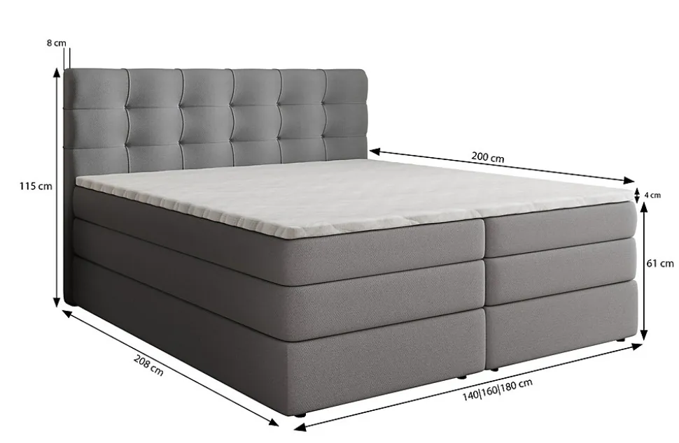 Lit Boxspring AREZI 140×200 cmLe lit AREZI combine un design moderne avec un confort de sommeil supérieur. Grâce à sa structure boxspring avancée, il garantit un soutien orthopédique et une fonctionnalité maximale pour votre chambre.SES ATOUTS : Technologie double matelas : Une base stable en ressorts Bonell combinée à un matelas supérieur à ressorts ensachés pour une adaptation parfaite à la silhouette. Rangement intelligent : Deux grands coffres intégrés sous le lit pour stocker la literie et gagner de l’espace. Ergonomie : Assise surélevée facilitant le lever et tête de lit rembourrée idéale pour lire ou regarder la TV. Finition : Revêtement en tissu SORO 90 élégant. Dos en tissu technique (à placer contre un mur). Dimensions +/- 5 cm. La couleur peut varier selon l’écran.DIMENSIONS : Longueur totale du lit : 208 cm Largeur totale du lit : 140 cm Hauteur de couchage : 61 cm Largeur de la tête de lit : 140 cm Hauteur tête de lit / pied de lit : 115 cm Hauteur des pieds : 2 cm Fermeté du matelas : Materac Bonellowy H2/H3 + Materac Pocketowy H2/H3