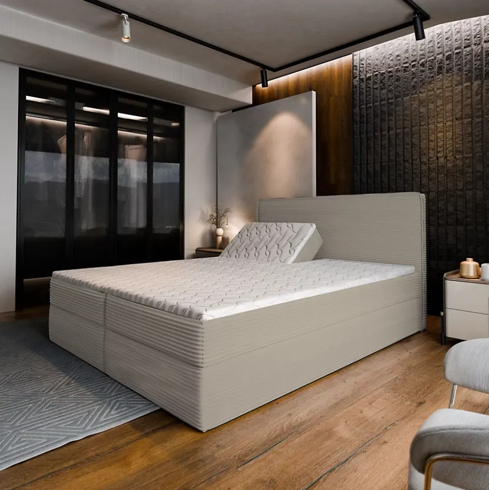 - Design élégant et contemporain – Le lit continental Moderne séduit par son style raffiné et sa finition soignée. Son revêtement en tissu Tkanina sztruksowa de type LINCOLN et sa couleur Beige s’intègrent parfaitement à tout type d’intérieur.