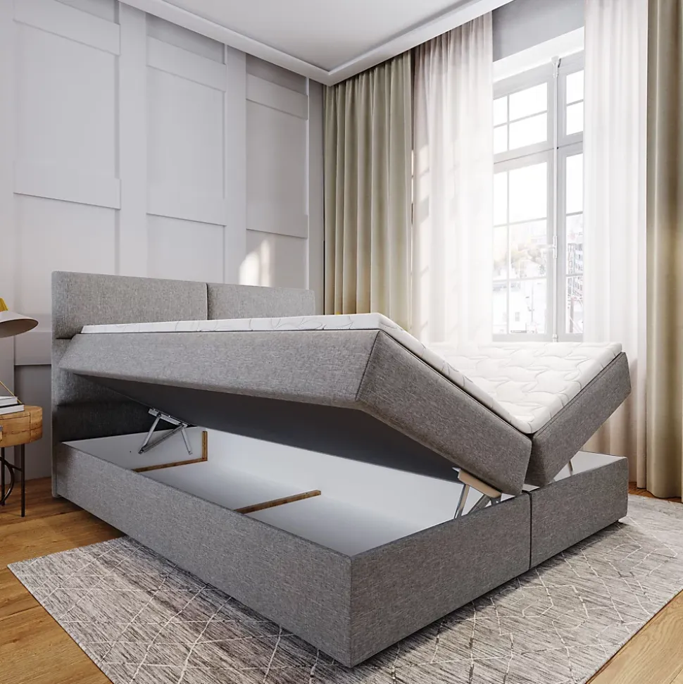Lit Masseno LONIS 160×200 cm – Confort et FonctionnalitéLe lit LONIS est la combinaison parfaite d’une élégance intemporelle et d’une ergonomie pensée pour votre bien-être. Ce modèle offre non seulement un design soigné, mais aussi une fonctionnalité maximale grâce à ses espaces de rangement et son confort de couchage supérieur.Caractéristiques principales : Matelas à ressorts Bonell : Assure un soutien progressif qui s’adapte dynamiquement au poids du corps. La structure garantit une ventilation optimale et une isolation phonique pour un sommeil sain et calme. Confort accru (Surmatelas) : Le lit est équipé d’un surmatelas qui rend la surface de couchage plus douce, améliorant considérablement la qualité de votre repos. Grands coffres de lit : Fabriqués en panneau stratifié robuste, ils offrent un vaste espace pour votre literie. L’accès est facilité par un mécanisme d’ouverture assistée qui réduit l’effort de levage. Construction solide : Le cadre en bois massif et panneau de particules assure la stabilité du lit et empêche le matelas de glisser. Montage simple : Assemblage rapide et sans effort grâce au système de crochets métalliques. Dimensions : Longueur totale : 207 cm Largeur totale : 160 cm Hauteur de la tête de lit : 98 cm Hauteur d’assise avec surmatelas : 49 cm Hauteur des pieds : 2 cm Dureté du matelas : H2/H3 Surface de couchage : 160×200 cm