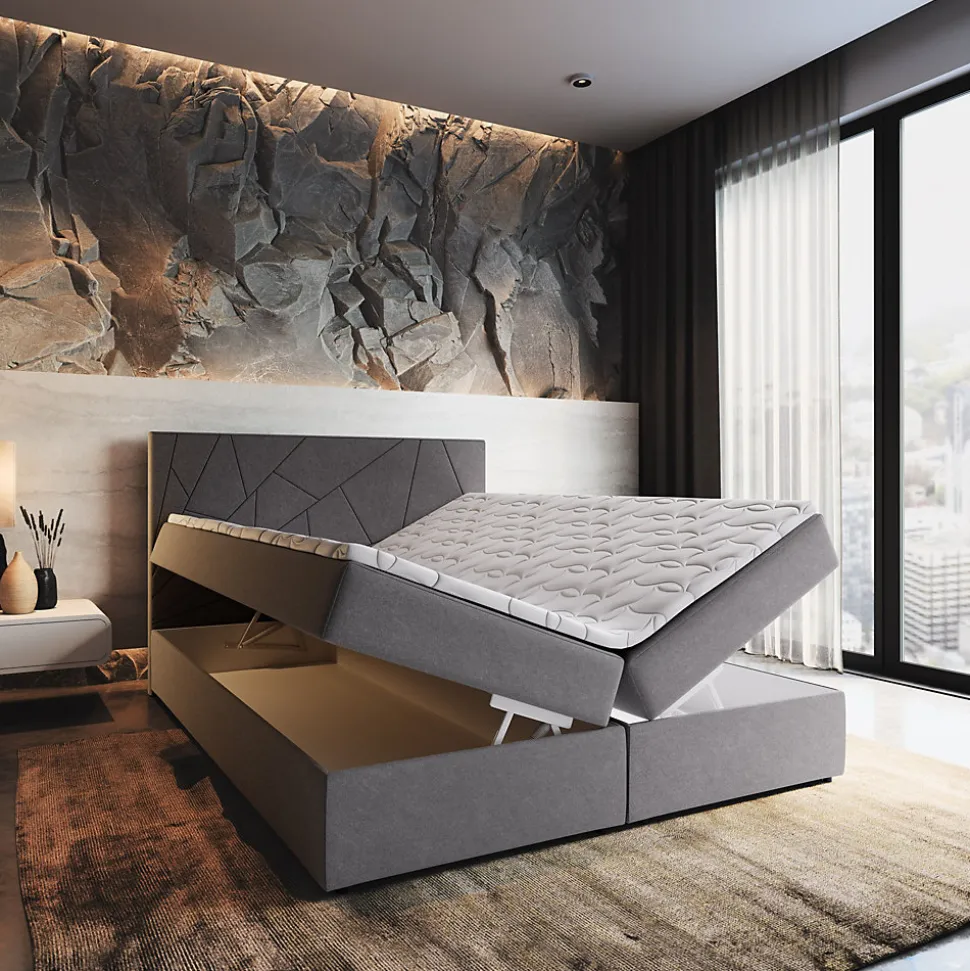 Lit Masseno MADO 160×200 cm – Confort et FonctionnalitéLe lit MADO est la combinaison parfaite d’une élégance intemporelle et d’une ergonomie pensée pour votre bien-être. Ce modèle offre non seulement un design soigné, mais aussi une fonctionnalité maximale grâce à ses espaces de rangement et son confort de couchage supérieur.Caractéristiques principales : Matelas à ressorts Bonell : Assure un soutien progressif qui s’adapte dynamiquement au poids du corps. La structure garantit une ventilation optimale et une isolation phonique pour un sommeil sain et calme. Confort accru (Surmatelas) : Le lit est équipé d’un surmatelas qui rend la surface de couchage plus douce, améliorant considérablement la qualité de votre repos. Grands coffres de lit : Fabriqués en panneau stratifié robuste, ils offrent un vaste espace pour votre literie. L’accès est facilité par un mécanisme d’ouverture assistée qui réduit l’effort de levage. Construction solide : Le cadre en bois massif et panneau de particules assure la stabilité du lit et empêche le matelas de glisser. Montage simple : Assemblage rapide et sans effort grâce au système de crochets métalliques. Dimensions : Longueur totale : 207 cm Largeur totale : 160 cm Hauteur de la tête de lit : 98 cm Hauteur d’assise avec surmatelas : 49 cm Hauteur des pieds : 2 cm Dureté du matelas : H2/H3 Surface de couchage : 160×200 cm
