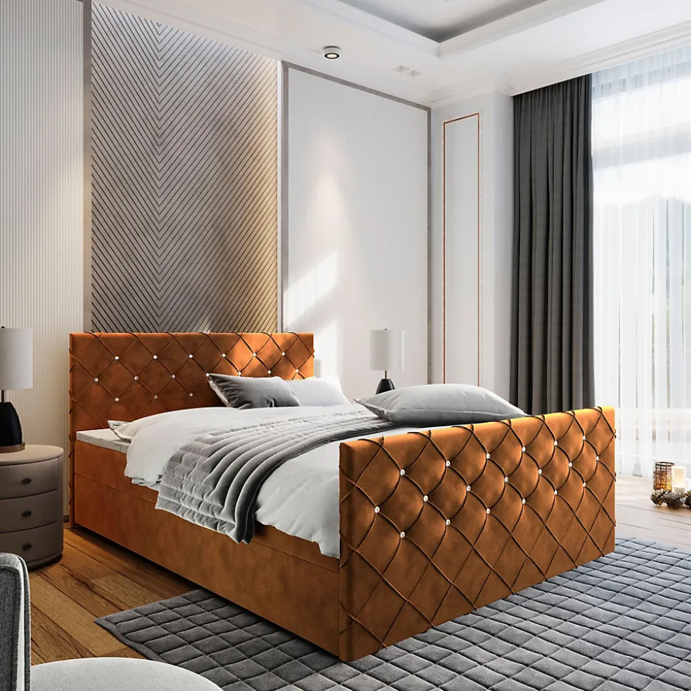 - Design élégant et contemporain – Le lit continental Glamour séduit par son style raffiné et sa finition soignée. Son revêtement en tissu Tkanina welurowa de type MAGIC VELVET et sa couleur Cuivré s’intègrent parfaitement à tout type d’intérieur.