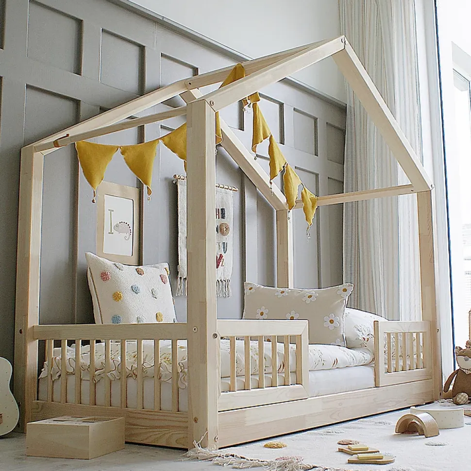 Lit cabane 90×190 barrières et sommier inclus pieds 1 cm Iris Bois
