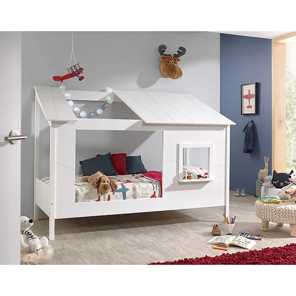 Lit Cabane 90×200 toit semi-ouvert et fenêtre Sommier inclus Vipack HouseBed – Blanc