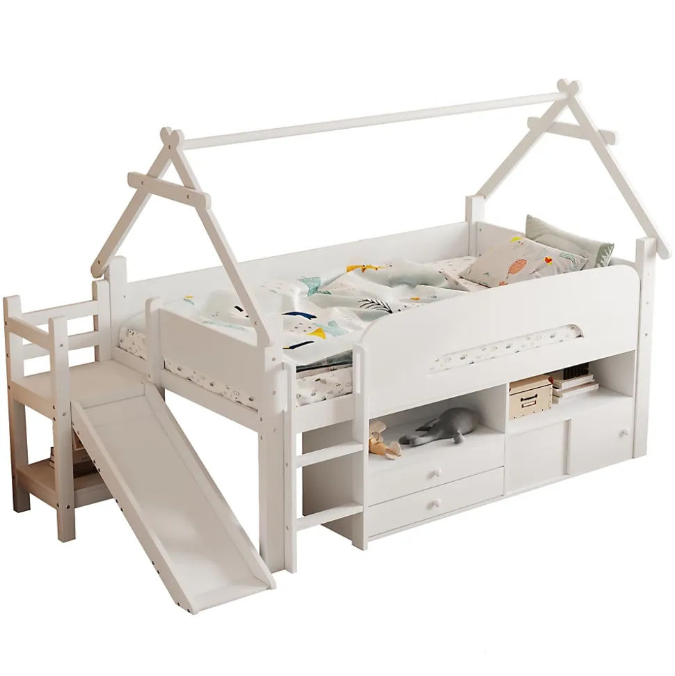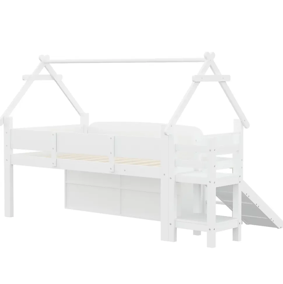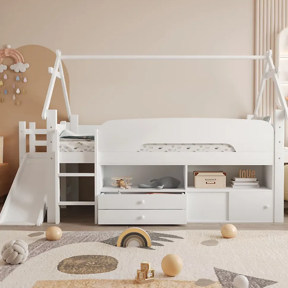 •【Conception gain de place】Ce lit mezzanine est idéal pour les petites chambres. Surélever le cadre de lit crée un espace de rangement supplémentaire en dessous. Il permet de garder la chambre bien rangée tout en offrant plus d’espace pour jouer ou d’autres activités.•【Toboggan amusant】Ce lit est équipé d’un toboggan intégré très amusant, permettant aux enfants de glisser en toute sécurité et de transformer l’heure du coucher en une aventure palpitante. Le toboggan est à la fois ludique et sûr, avec une surface lisse et une construction robuste.•【Barrières de sécurité robustes】Conçu avec la sécurité comme priorité absolue, ce lit est équipé de barrières de sécurité sur le lit supérieur pour assurer la sécurité des enfants pendant la nuit. Ces barrières rassurent les parents et permettent aux enfants de dormir paisiblement sans craindre les chutes.•【Nombreuses options de rangement】Diverses options de rangement sont disponibles sous le cadre de lit, notamment des étagères ouvertes, des tiroirs et des placards à portes coulissantes. Cet espace de rangement est suffisant pour les vêtements, les jouets, les livres et plus encore, contribuant ainsi à garder la chambre propre et organisée.•【Espace de jeu sous le lit】L’espace sous le lit mezzanine offre non seulement du rangement, mais aussi un véritable espace de jeu. Ce lit mezzanine offre un espace généreux pour les jouets et les équipements de jeu, permettant à votre enfant de dormir et de jouer au même endroit.•【Structure robuste et durable】Fabriqué avec des matériaux de haute qualité, ce lit mezzanine est à la fois durable et stable. Sa structure robuste assure un maintien optimal de votre enfant et résiste à l’usure quotidienne d’un enfant actif.•【Facile à assembler】Des instructions détaillées et des pièces complètes sont disponibles pour vous aider à réaliser l’assemblage rapidement.