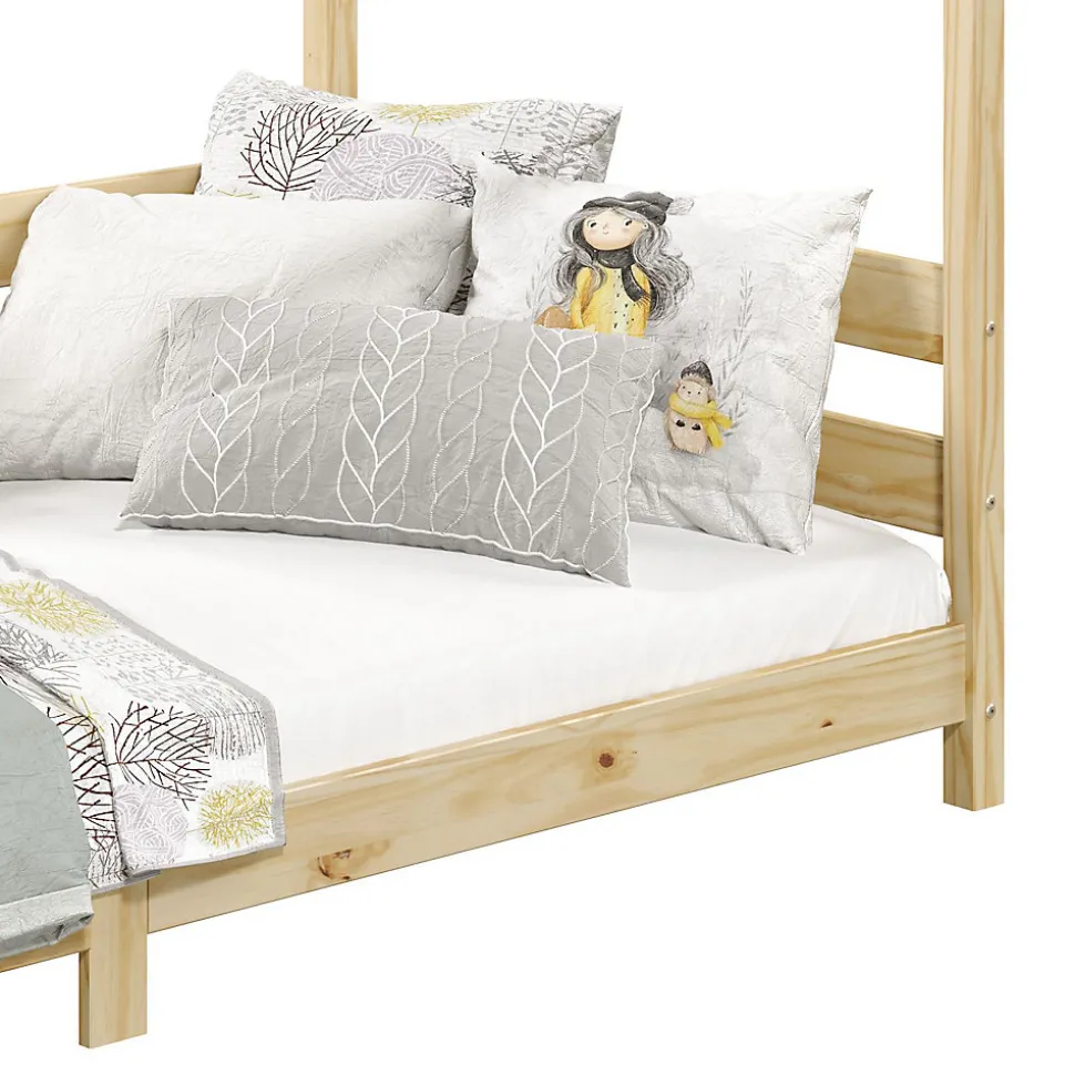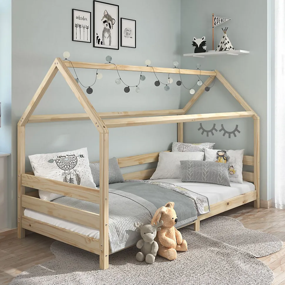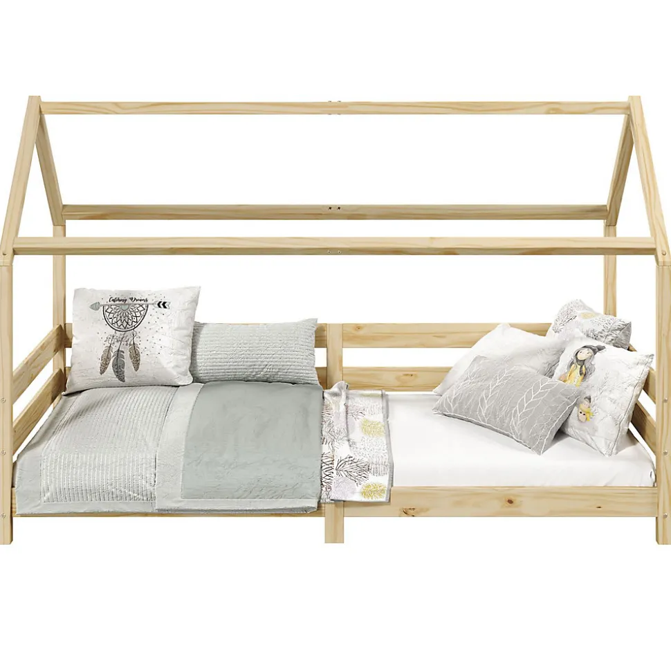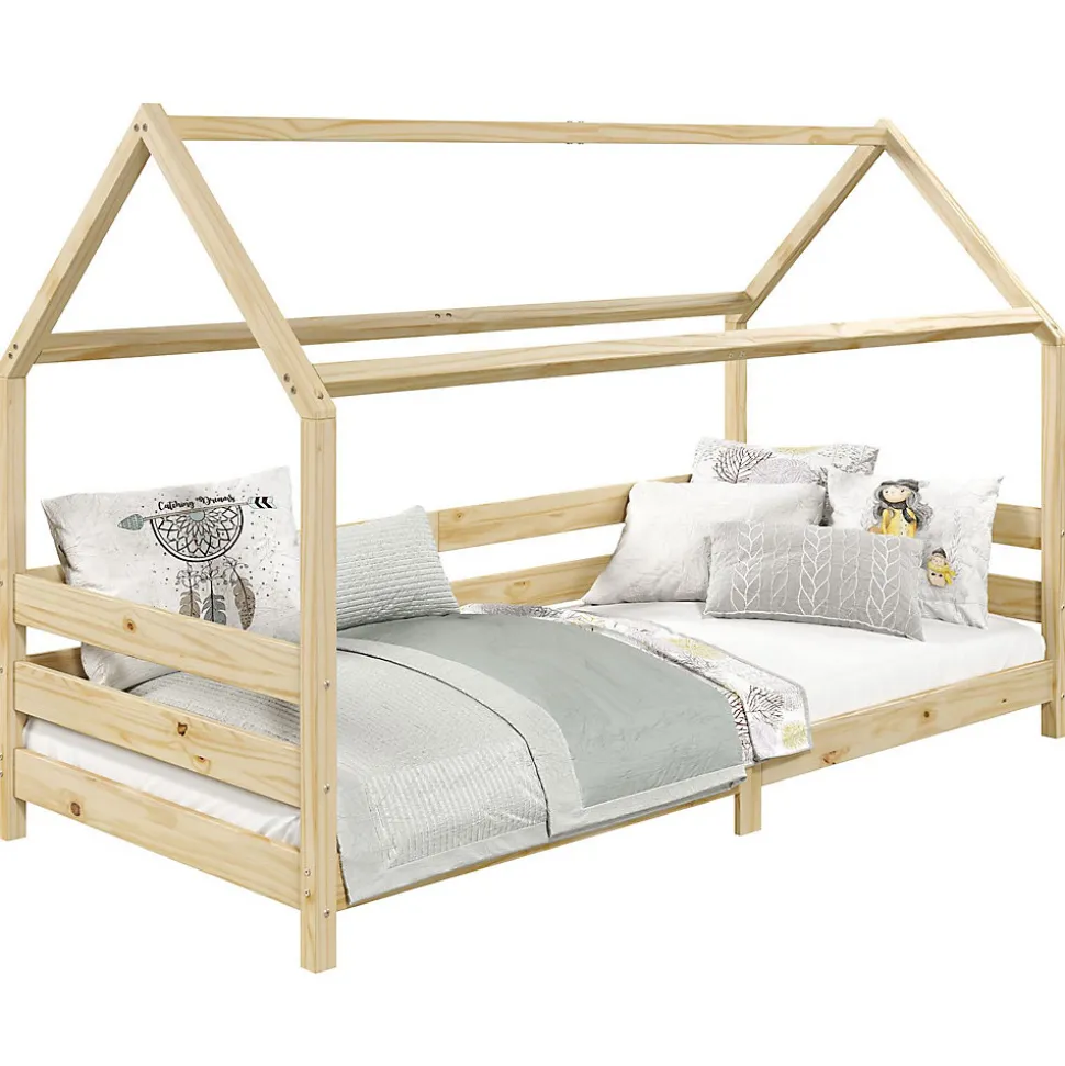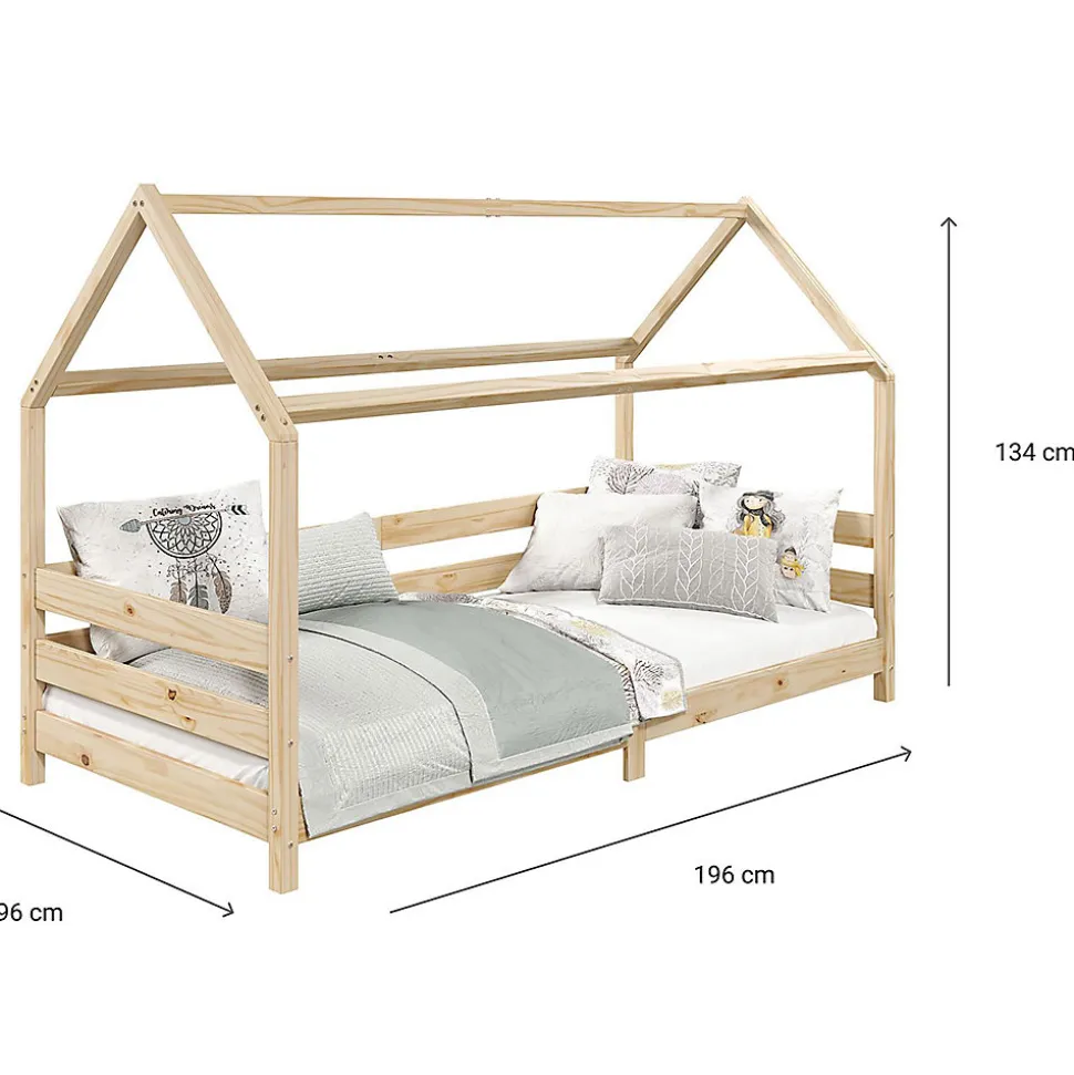 Le lit cabane Fina … apportera un plus dans la décoration de la chambre de votre enfant grâce à sa structure minimaliste en pin massif. Vous pourrez facilement le personnaliser en y accrochant des guirlandes, des voilages ou autres objets de décoration. Les barrières de protection sur 3 des côtés assureront la sécurité de votre enfant durant son sommeil. Et la partie ouverte lui permettra de monter et descendre facilement et en toute autonomie de son lit. Description des matériaux : – La structure du lit est en pin massif et recouvert d’un vernis à la finition naturelle. – La madrure du bois reste visible. Caractéristiques du produit : – Couchage: 90 x 190 cm – Sans sommier et sans matelas – Barre de renfort – Design en forme de cabane Livraison et montage : – Contenu de la livraison : Cadre de lit, sans décoration, notice de montage – Le produit est livré en pièces détachées – Assemblage facile grâce à la notice – Sans sommier et sans matelas – Photo non contractuelle Résumé: – Convient uniquement avec: Sommier fagot à lattes – Surface: La madrure du bois reste visible – Dimensions monté: 134 x 96 x 196 cm (H x L x L) – Couchage: 90 x 190 cm – Couleur: Naturel – Matériel: Pin massif