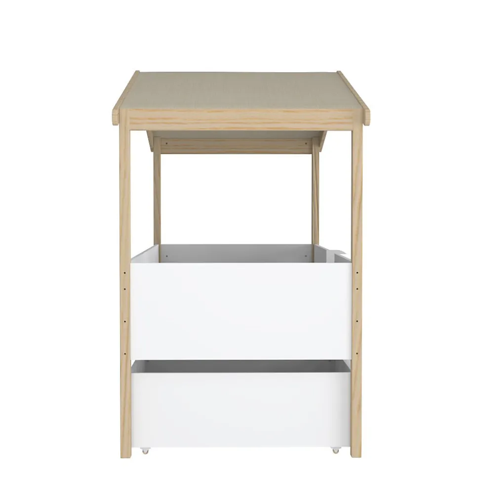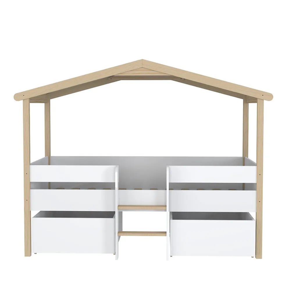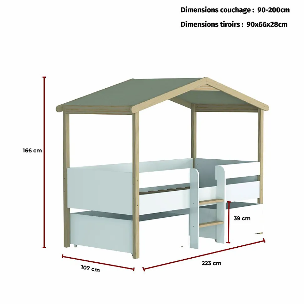 Offrez à votre enfant un cocon douillet pour des nuits paisibles avec ce lit cabane. La forme mignonne de la petite maison donne à la chambre des enfants une atmosphère animée. Il n’y a pas de limites à l’imagination, vous pouvez décorer le lit cabane avec votre enfant.Astucieux, il possède également deux grands tiroirs de rangement montés sur roulettes très pratique pour ranger jouets et linge de lit en un clin d’œil.Matériel: Bois massif, MDF et panneau de particules blancSommier à lattesToit en toile polyester beige pouvant être retirée pour le lavage.* Charge maximale d’utilisation : 80 kgDimensions:Zone de couchage 90x190cmLongueur : 213cmLargeur : 107cmHauteur : 166cmDimension d’un tiroir (en cm): 90x66x28ATTENTION le matelas et la décoration ne sont pas compris dans la livraison*Les couleurs réelles peuvent différer de ceux indiqué dans l’image en raison de la nature des paramètres de couleur de photographier et de moniteur.*Déconseillé aux enfants de moins de 4 ans. S’ils ne sont pas utilisés correctement, les lits cabanes peuvent présenter un risque de blessure par étranglement : ne rien suspendre au lit, ne pas se suspendre et ne pas sauter sur le lit.Support client et SAV en Français – Pas de livraison dans le DOM TOM et la Corse.**Attention la livraison est prévue au pied de l’immeuble ou de la maison et non à domicile.