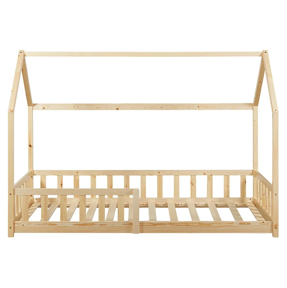 Lit enfantTransformez la chambre de votre enfant en un petit paradis accueillant pour dormir et jouer avec notre lit cabane en bois naturel. Équipé d’une barrière protectrice à la fois décorative et utile, votre enfant sera toujours en sécurité pendant son sommeil.Description :- lit cabane en forme de maison- barrière protectrice- montage facile- capacité de charge : 120 kgMatière :- cadre : bois de pin- sommier : contreplaquéDimensions :- totales (lo x la x ha) : 205 x 96 x 143 cm- surface de couchage (lo x la) : 200 x 90 cmCouleur :naturelMatelas à mousse à froidCe matelas offre à votre enfant un confort optimal pendant le sommeil. Il est anti-allergique et sa housse est perméable à l’air et à l’humidité.Description :- housse matelassée de 1,5 cm en polyester- anti-allergique, respirant, résistant à l’usure- coupé d’une pièce de mousse- grâce à son aération optimale, il est froid en été et chaud en hiver- entretien de la housse amovible : ne la mettez pas à la machine à laver, ne faites pas la blanchir à la javel, ne la repassez pas, ne la nettoyez pas avec des produits chimiquesDimensions (la x lo x ha) : 90 x 200 x 16 cmContenu de la livraison :1 x lit1 x sommier à lattes1 x matelasProduit de la marque :[en.casa] et [neu.haus]A noter :Le matelas est expédié séparément, il peut arriver avant ou après le lit.
