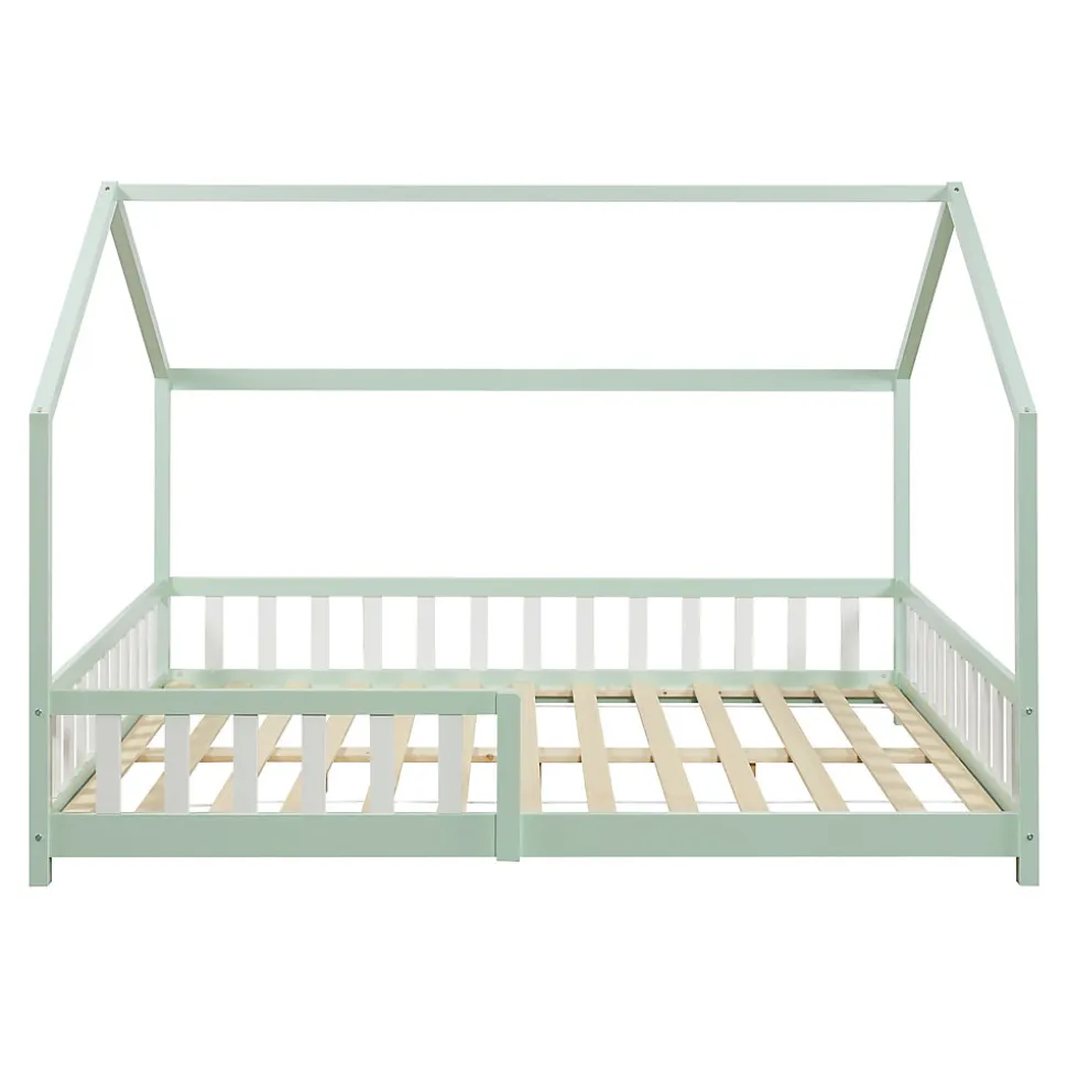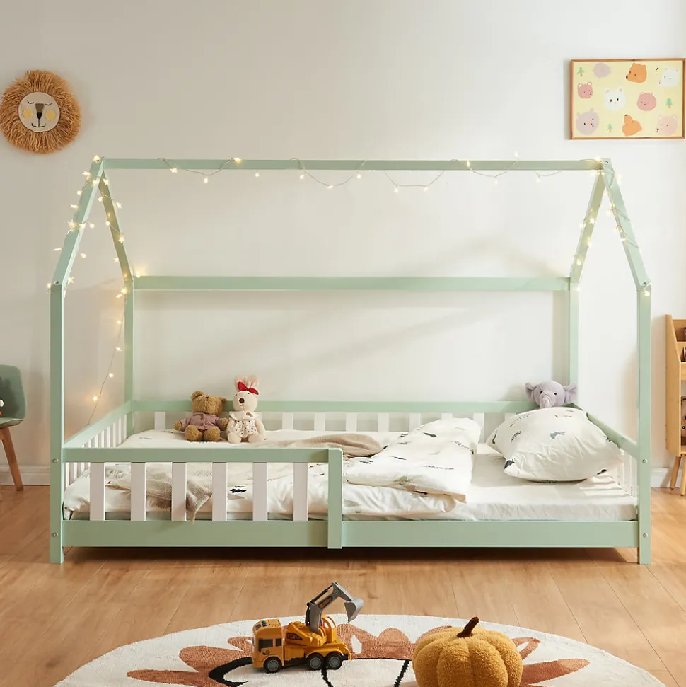 Lit enfantTransformez la chambre de votre enfant en un petit paradis accueillant pour dormir et jouer avec notre lit cabane en bois naturel. équipé d’une barrière protectrice à la fois décorative et utile, votre enfant sera toujours en sécurité pendant son sommeil. Avec son toit en forme de maison, il crée instantanément une ambiance cocooning. Qu’il s’agisse d’une chambre au design moderne ou classique, notre lit pour enfant s’adapte à tous les styles d’intérieur.Description :- lit cabane en forme de maison- s’adapte à différents styles de décoration- barrière protectrice pour un sommeil tranquille- construction robuste et montage facile- capacité de charge : 120 kgMatière :- cadre du lit : bois de pin- sommier : contreplaquéDimensions :- totales (longueur x largeur x hauteur) : 205 x 126 x 140 cm- surface de couchage (longueur x largeur) : 200 x 120 cm- distance entre le sol et le bas du toit : 94 cm- largeur de l’ouverture de la barrière : 97 cm- hauteur de la barrière : 40 cm- hauteur du pied : 5,5 cmCouleur :vert mentheContenu de la livraison :1 x lit enfant1 x sommier à lattes standard (modèle simple)A noter :Le matelas, l’oreiller, la couverture et tous les autres objets de décoration ne font pas partie de l’offre.Produit de la marque :[en.casa]
