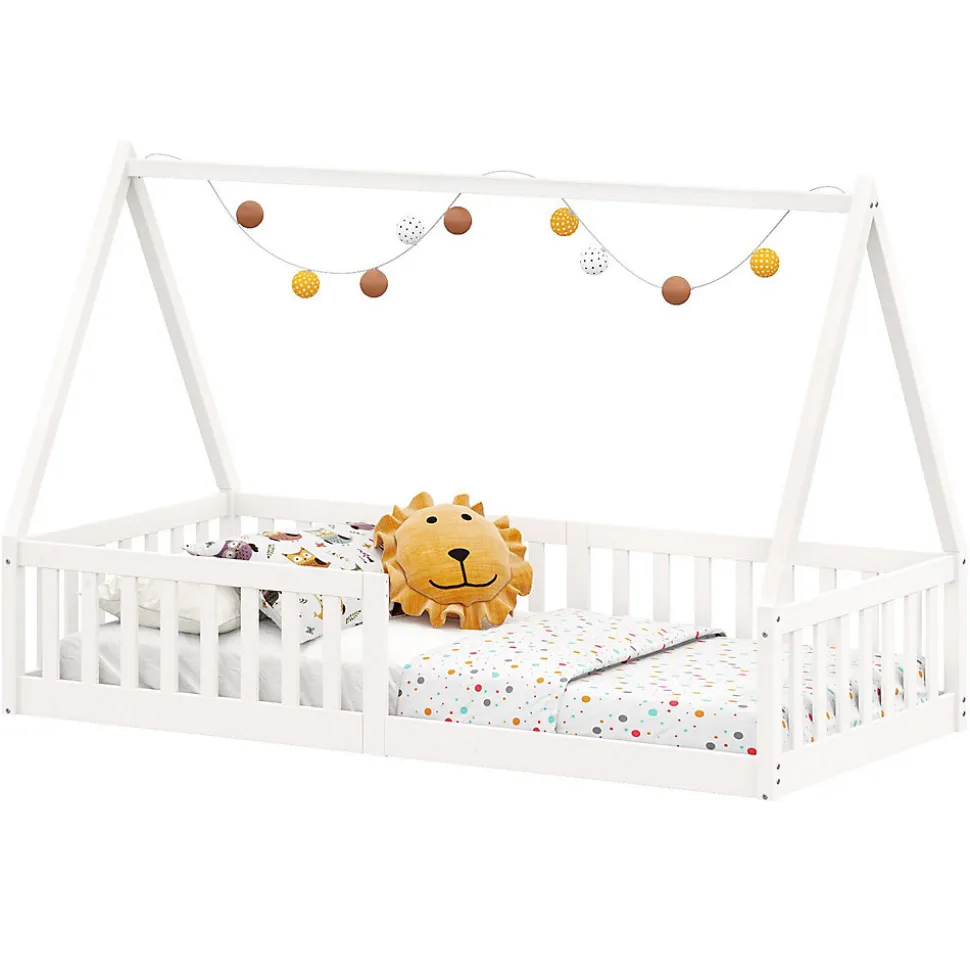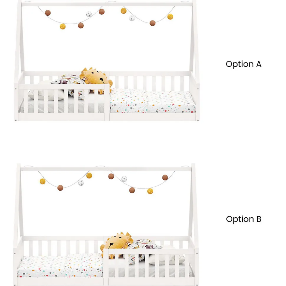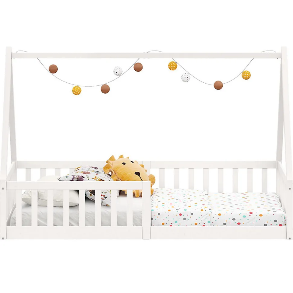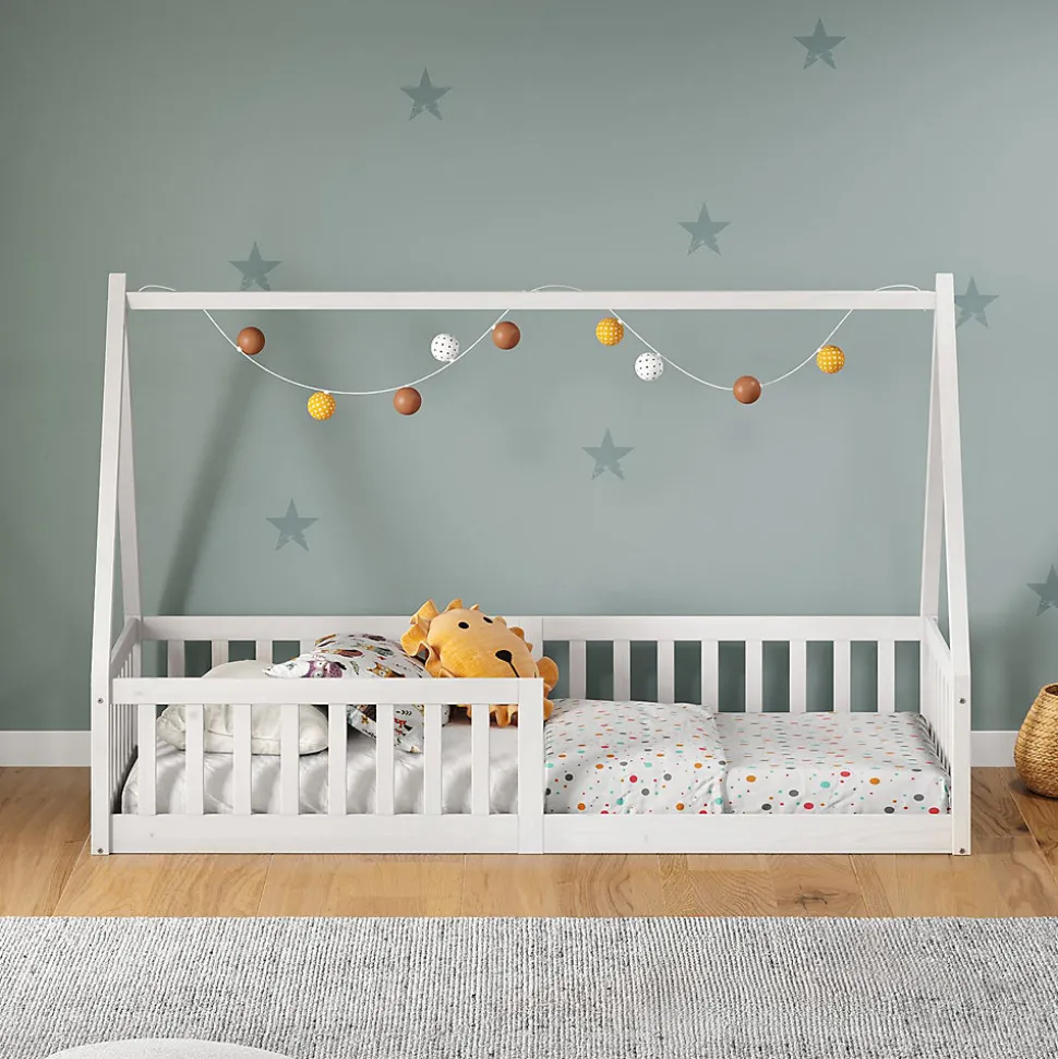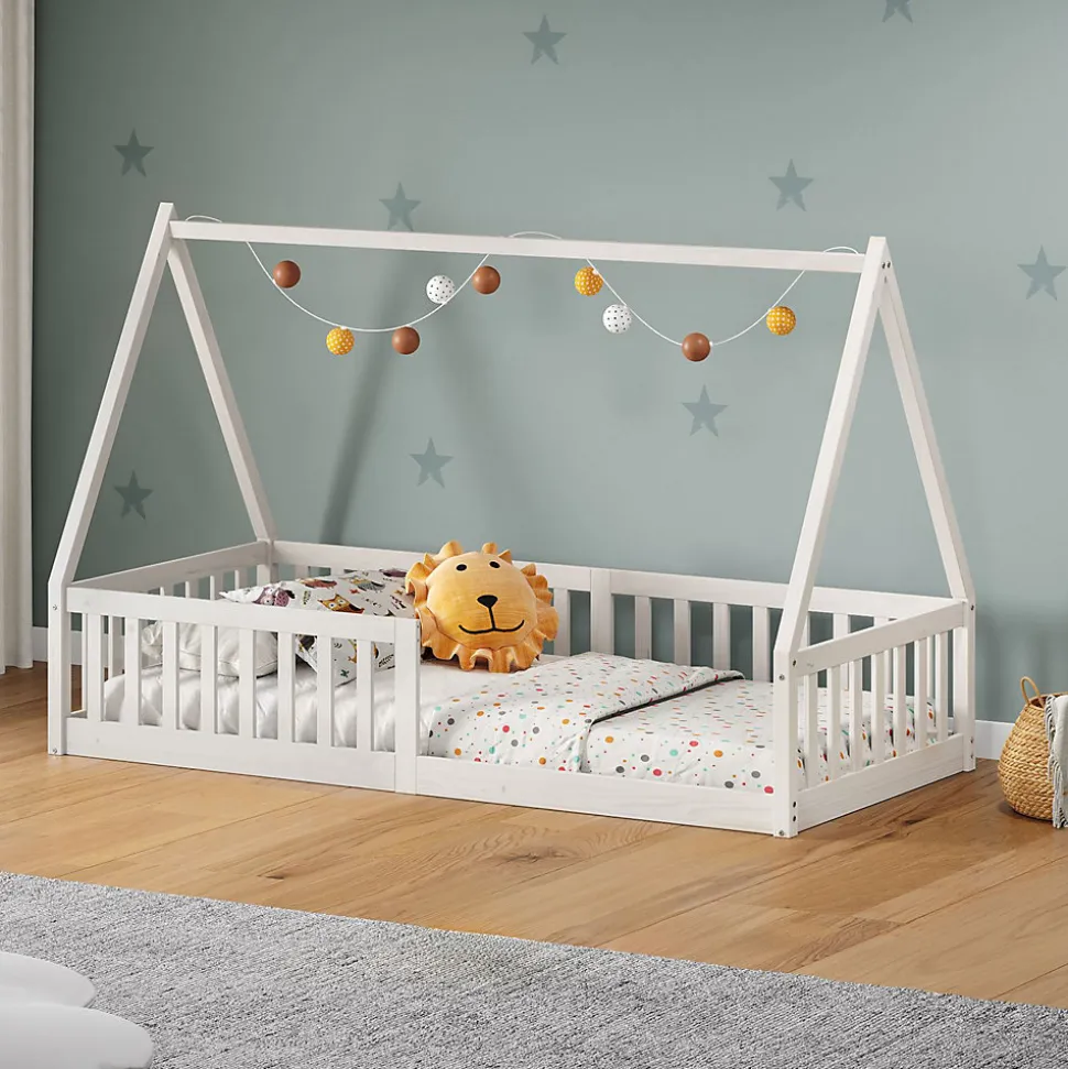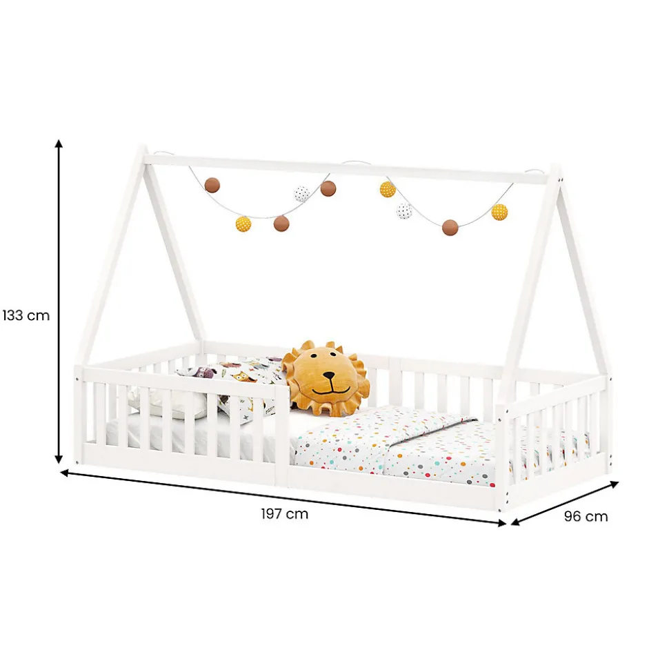 Le lit cabane Nicolas … allie sécurité et confort avec son design en bois de pin massif. Spécialement pensé pour les enfants et les bébés, il facilite une transition en douceur vers l’autonomie grâce à sa structure au sol inspirée de la méthode Montessori. équipé d’une barrière de sécurité, il garanti des nuits tranquilles, offrant aux jeunes enfants un espace sécurisé où ils peuvent rêver et grandir en tout sérénité. Description des matériaux : – La structure du lit est en pin massif laqué blanc. – La madrure du bois reste visible. Caractéristiques du produit : – Couchage: 90 x 190 cm – Position de la barrière modulable (droite ou gauche) – Sans sommier et sans matelas – Barrières de protection – Design en forme de cabane Livraison et montage : – Contenu de la livraison : Cadre de lit, sans décoration, notice de montage – Le produit est livré en pièces détachées – Assemblage facile grâce à la notice – Sans sommier et sans matelas – Photo non contractuelle Résumé: – Hauteur cadre de lit: 9 cm – Hauteur pan de lit: 9 cm – Hauteur pied de lit: 42 cm – Hauteur tête de lit: 42 cm – Profondeur d’insertion: 60 cm – Consignes de sécurité: Protection contre les chutes – Convient uniquement avec: Sommier fagot à lattes – Sommier: vendu séparément – Surface: Lasuré, La madrure du bois reste visible – Dimensions monté: 132 x 197 x 96 cm (H x L x L) – Couchage: 90 x 190 cm – Couleur: Blanc – Matériel: Pin massif