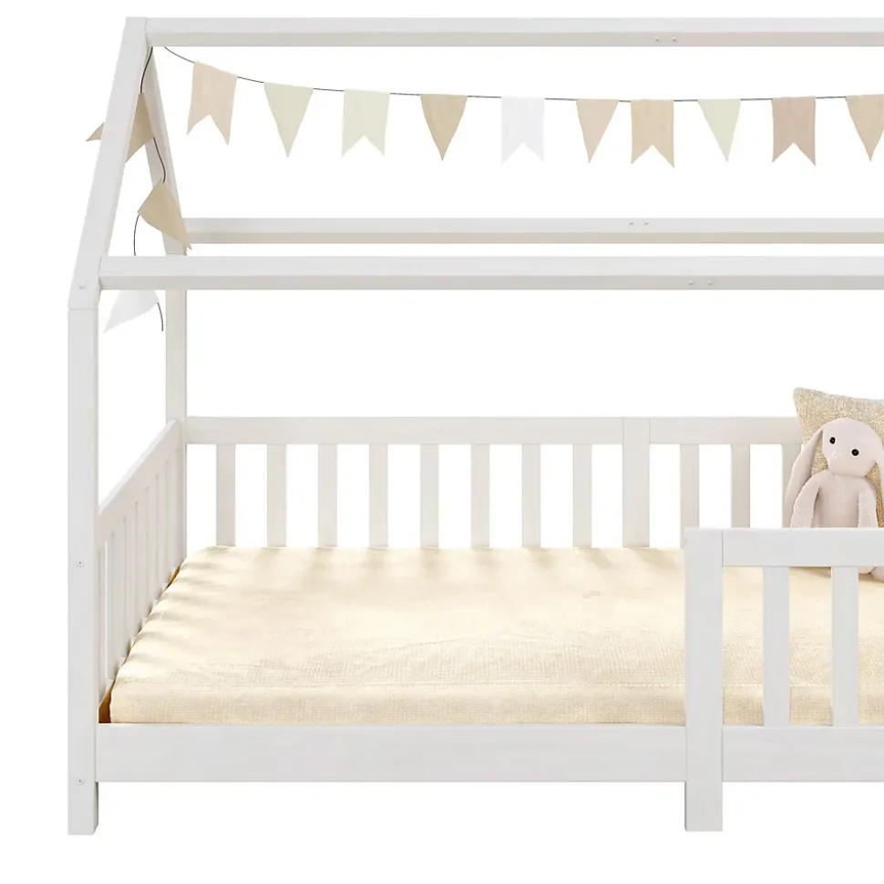 Le lit cabane Nina … sera parfait pour développer l’autonomie et l’indépendance de votre enfant. Le grand espace d’accés lui permettra d’entrer et de sortir facilement et en toute liberté de son lit. La sécurité est assurée par les barrières entourant le couchage afin d’éviter les chutes. Sa structure en forme de maisonnette et aux lignes épurées s’intégrera aisément quelque soit votre décoration ! Description des matériaux : – La structure du lit est en pin massif et recouvert d’une lasure de coloris blanc. – La madrure du bois reste visible. Caractéristiques du produit : – Couchage: 90 x 190 cm – Position de la barrière modulable (droite ou gauche) – Sans sommier et sans matelas – Barre de renfort – Design en forme de cabane Livraison et montage : – Contenu de la livraison : Cadre de lit, sans décoration, notice de montage – Le produit est livré en pièces détachées – Assemblage facile grâce à la notice – Sans sommier et sans matelas – Photo non contractuelle Résumé: – Convient uniquement avec: Sommier fagot à lattes – Surface: La madrure du bois reste visible – Dimensions monté: 135 x 96 x 196 cm (H x L x L) – Couchage: 90 x 190 cm – Couleur: Blanc – Matériel: Pin massif