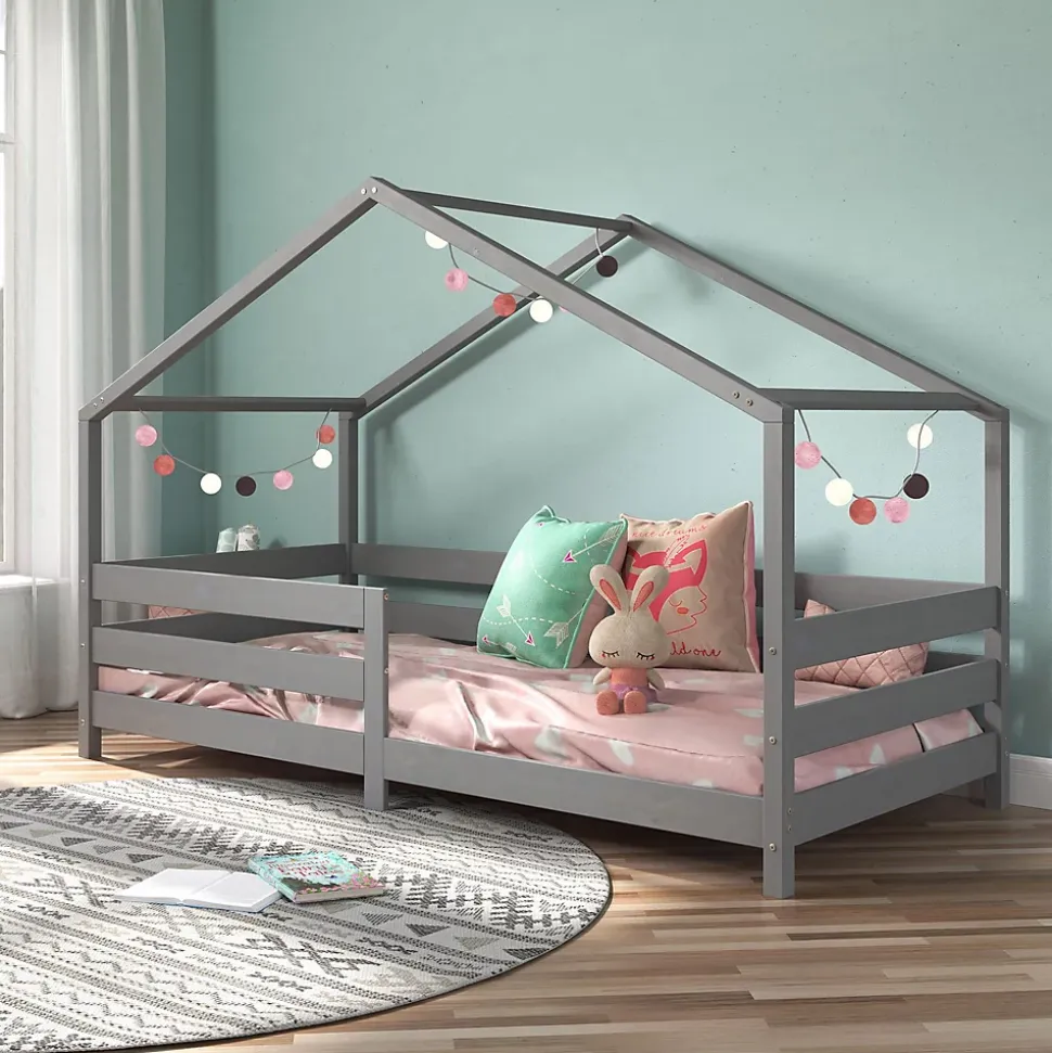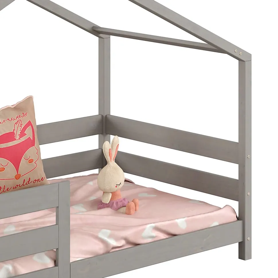 Le lit cabane Rena … apportera une touche d’originalité dans la chambre de votre enfant. Facile à personnaliser, vous pourrez y ajouter des voilages ou des guirlandes afin de stimuler l’imaginaire de votre enfant. Les barrières horizontales lui assureront un sommeil en toute sécurité et donne encore plus l’impression de dormir dans une maisonnette. Avec sa structure en pin massif en forme de maison minimaliste, ce lit enfant s’accordera parfaitement avec le reste de votre mobilier ! Description des matériaux : – La structure du lit est en pin massif et recouvert d’une lasure de coloris gris. – La madrure du bois reste visible. Caractéristiques du produit : – Couchage: 90 x 200 cm – Position de la barrière modulable (droite ou gauche) – Sans sommier et sans matelas – Barre de renfort – Design en forme de cabane Livraison et montage : – Contenu de la livraison : Cadre de lit, sans décoration, notice de montage – Le produit est livré en pièces détachées – Assemblage facile grâce à la notice – Sans sommier et sans matelas – Photo non contractuelle Résumé: – Convient uniquement avec: Sommier fagot à lattes – Sommier: vendu séparément – Surface: La madrure du bois reste visible – Dimensions monté: 138 x 96 x 206 cm (H x L x L) – Couchage: 90 x 200 cm – Couleur: Gris – Matériel: Pin massif
