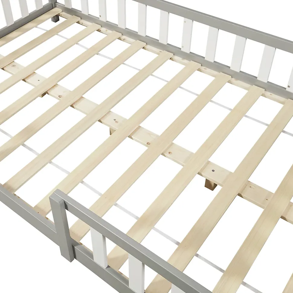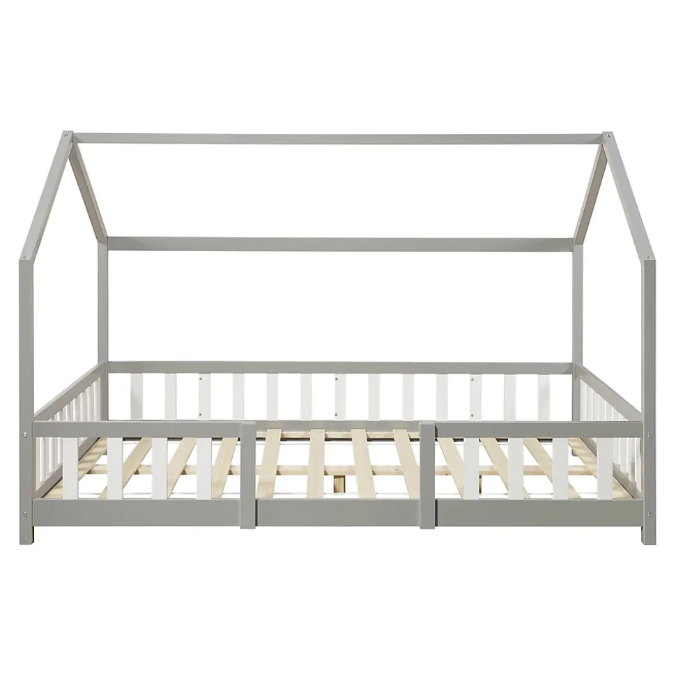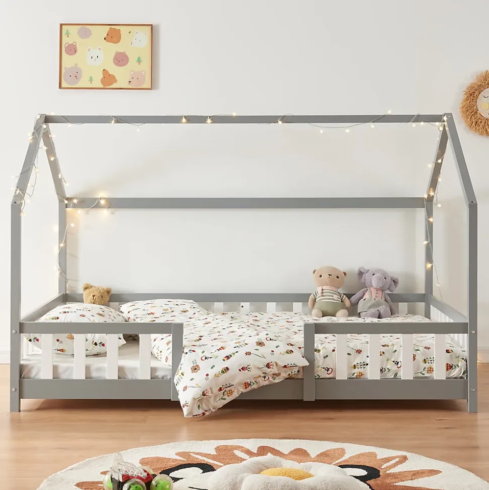 Lit cabane avec matelasOffrez à votre enfant un espace douillet et magique avec ce lit cabane en bois.Points forts :- lit confortable en forme de maison- convient aux filles et aux garçons- la bordure de la clôture sert de protection contre les chutes- montage rapide- capacité de charge jusqu’à 150 kgDimensions (l x l x h) :- totales : 206 x 126 x 135 cm- matelas : 200 x 120 x 16 cm- hauteur du sol au bord du toit : 90 cm- largeur de l’entrée : 50 cm- hauteur de la clôture : 40 cm- hauteur des pieds : 5,5 cmMatière :- cadre de lit : bois de pin- sommier : contreplaquéCouleur :gris clair / blancMatelas en mousse froide- fabriqué en UE- housse matelassée de 1,5 cm en polyester- finition soignée, fines coutures piquées- anti-allergique, respirant, résistant à l’usure- coupé d’une pièce de mousse- grâce à son aération optimale, il est froid en été et chaud en hiver- entretien de la housse : ne la mettez pas à la machine à laver, ne faites pas la blanchir à la javel, ne la repassez pas, ne la nettoyez pas avec des produits chimiquesContenu de la livraison :- 1 x lit d’enfant- 1 x sommier à lattes standard (modèle simple)- 1 x matelasA noter :Pour des raisons logistiques, le retrait sur place n’est pas possible. La livraison se fait jusqu’au trottoir ou à la porte d’entrée, sans montage.Le matelas est expédié séparément, il peut arriver avant ou après le lit.Produits de la marque :[en.casa] et [neu.haus]