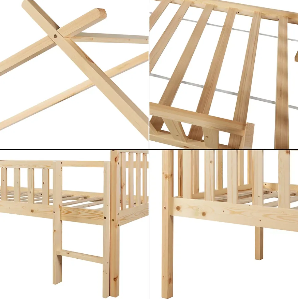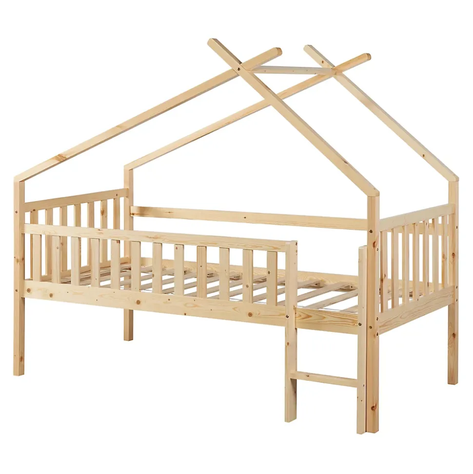 Lit cabaneCe lit enfant en bois naturel transforme chaque chambre en un paradis magique pour dormir et jouer. Gâce à son design en forme de maison, il crée une atmosphère confortable pour les petits aventuriers. C’est un lieu de sommeil reposant pour votre petit et il s’intègre parfaitement dans différents styles de décoration. Sa conception permet de le personnaliser avec des guirlandes pour une ambiance chaleureuse. Transformez la chambre de votre enfant en un lieu plein de magie avec ce lit cabane enchanteur.Points forts :- lit enfant surélevé en forme de maison- convient aux filles et aux garçons- avec une petite échelle robuste et une barrière de protection- montage rapide et facile- peut supporter jusqu’à 100 kgMatière :- cadre de lit : bois de pin- sommier à lattes : contreplaquéDimensions :- totales (longueur x largeur x hauteur) : 206 x 97 x 170 cm- surface de couchage (longueur x largeur) : 200 x 90 cm- hauteur du sol au bord du toit : 100 cm- hauteur du couchage : 40 cm- largeur de l’entrée : 33 cm- écart entre les échelons : 19 cmCouleur :naturelContenu de la livraison :1 x lit d’enfant1 x sommier à lattes standard (modèle simple)A noter :Le matelas, l’oreiller, la couverture et tous les autres objets de décoration ne font pas partie de l’offre.Produit de la marque :[en.casa]