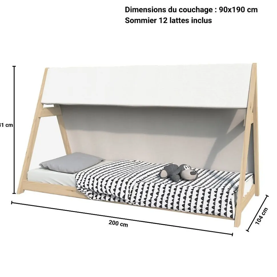 Lit cabane TIPI 90 x 190 cmTransformez la chambre de votre enfant en un petit havre de paix avec le lit TIPI. Ce lit en forme de cabane apporte une touche ludique et originale à la décoration et transforme véritablement le coin nuit en un espace multifonction pour s’évader, lire, jouer et faire de beaux rêves. Grâce à son sommier proche du sol et sa structure robuste, il est sécurisant et s’inscrit parfaitement dans la pédagogie Montessori.Caractéristiques : Structure en épicéa ou tilleul massifFinition : Brut.Sommier à 12 lattes en épicéa.Toit en toile polyester coloris beige.Livré démonté, avec la toile tissu avec sommier et sans matelas. A monter soi-mêmeDimensions:200x104x131 cm