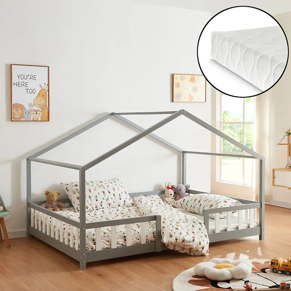 Lit cabaneOffrez à votre enfant un espace douillet et magique avec ce lit cabane en bois.Points forts :- construction solide- montage facile- la grille sert de protection contre les chutes- capacité de charge jusqu’à 120 kgDimensions :- totales (lo x la x h) : 207 x 126 x 138 cm- entrée de lit (h x la) : 15 x 50 cm- hauteur de la grille: 34 cm- distance du sol au bord du toit : 85 cmMatière :- lit: bois de pin- sommier à lattes: contreplaquéCouleur :gris / blanc, laqué matMatelas à mousse à froid (200 x 120 cm)- fabriqué en UE, certifié du label Confiance textile Oeko-Tex Standard 100- housse matelassée de 1,5 cm en polyester- finition soignée, fines coutures piquées- anti-allergique, respirant, résistant à l’usure- coupé d’une pièce de mousse- grâce à son aération optimale, il est froid en été et chaud en hiver- entretien de la housse : ne la mettez pas à la machine à laver, ne faites pas la blanchir à la javel, ne la repassez pas, ne la nettoyez pas avec des produits chimiquesContenu de la livraison :1 x lit d’enfant1 x sommier à lattes1 x matelasA noter :Pour des raisons logistiques, le retrait sur place n’est pas possible. La livraison se fait jusqu’au trottoir ou à la porte d’entrée, sans montage.Le matelas est expédié séparément, il peut arriver avant ou après le lit.Produits de la marque :[en.casa] et [neu.haus]
