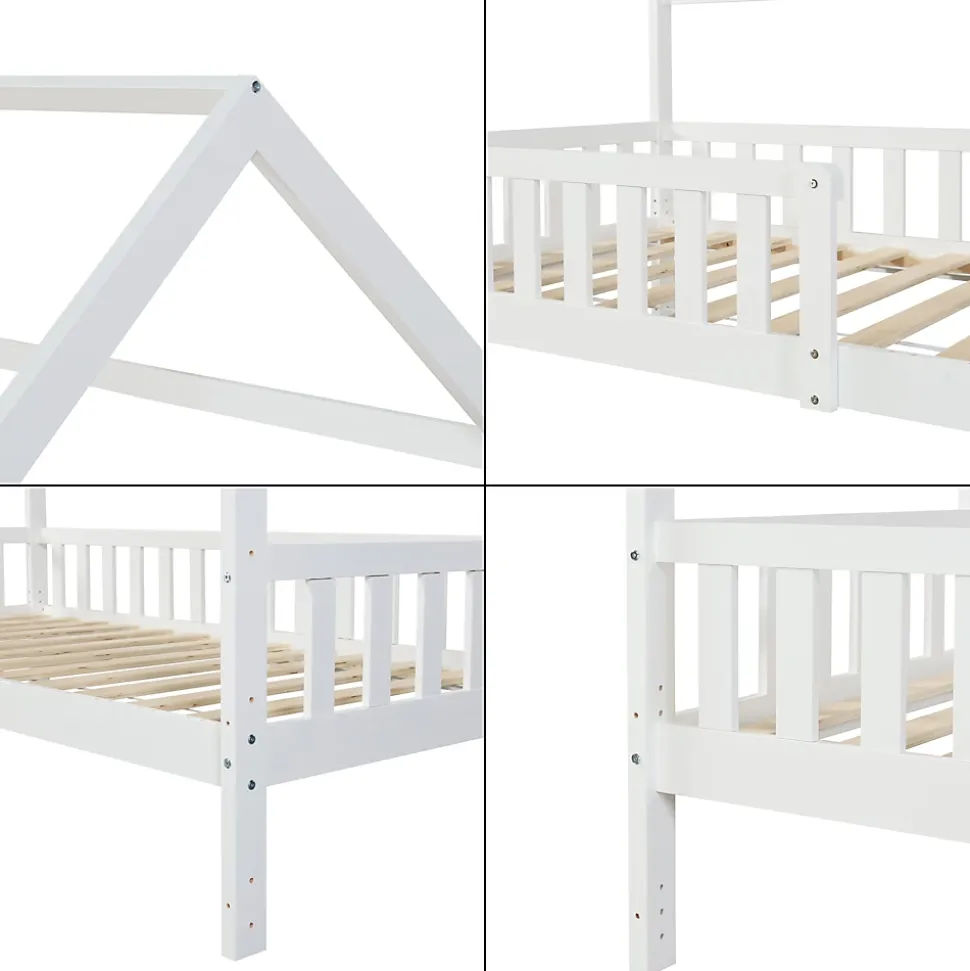Lit cabaneCe lit enfant en bois naturel transforme chaque chambre en un paradis magique pour dormir et jouer. Gâce à son design en forme de maison, il crée une atmosphère confortable pour les petits aventuriers. C’est un lieu de sommeil reposant pour votre petit, et il s’intègre parfaitement dans différents styles de décoration. Sa conception permet de le monter de façon surélevée, vous permettant ainsi de gagner de l’espace de rangement, ou près du sol. Transformez la chambre de votre enfant en un lieu plein de magie avec ce lit cabane enchanteur.Points forts :- lit enfant en forme de maison- convient aux filles et aux garçons- avec une barrière de protection- montage rapide et facile- peut supporter jusqu’à 120 kgMatière :- cadre de lit : bois de pin- sommier à lattes : contreplaquéDimensions :- totales (longueur x largeur x hauteur) : 207 x 100 x 140 cm- surface de couchage (longueur x largeur) : 200 x 90 cm- hauteur du sol au bord du toit : 90 cm- largeur de l’entrée : 96 cm – hauteur de la barrière : 37 / 57 cm- hauteur des pieds : 3 / 23 cmCouleur :blancContenu de la livraison :1 x lit d’enfant1 x sommier à lattes standard (modèle simple)A noter :Le matelas, l’oreiller, la couverture et tous les autres objets de décoration ne font pas partie de l’offre.Produit de la marque :[en.casa]