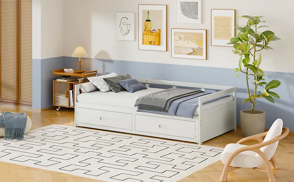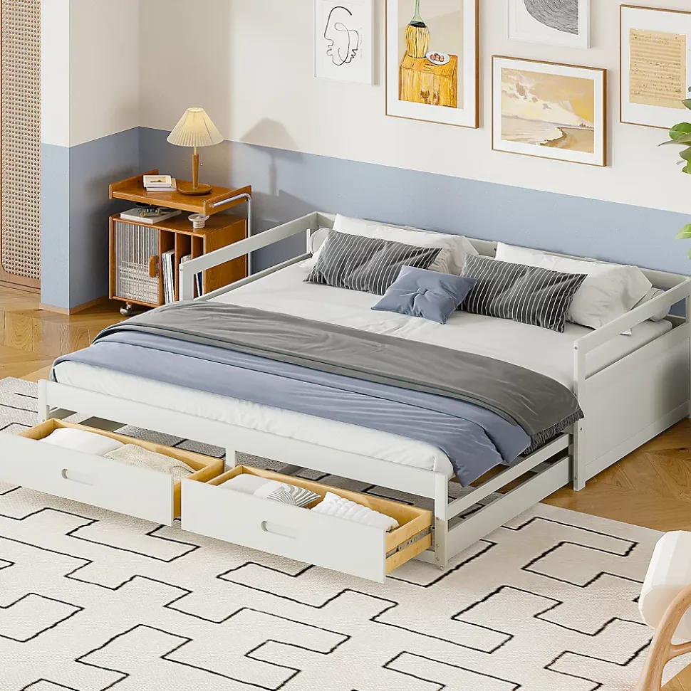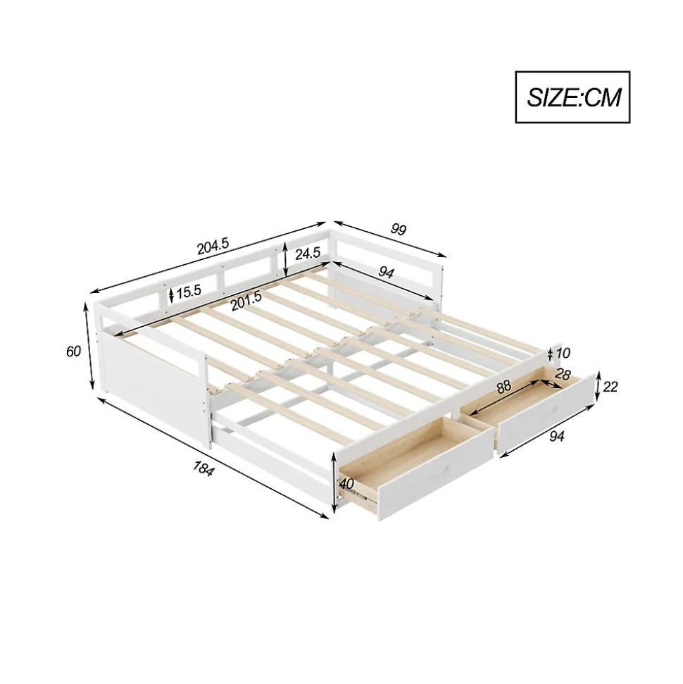 Cadre de lit en pin ce canapé convertible est fabriqué en pin de haute qualité respectueux de l environnement et durable le cadre en bois est bien ventilé et stable pour un sommeil confortableCadre extensible le cadre inférieur comporte un second cadre pouvant être tiré les deux cadres peuvent être assemblés pour obtenir cent quatre vingt par deux cents cm facile à utiliser comme lit simple ou doubleAvec rangement ce cadre en pin est équipé de deux tiroirs dont le fond possède quatre roulettes permettant de nettoyer facilement sous le litDesign à bords droits le design à bords droits économise de l espace et les tiroirs de rangement permettent de garder la pièce organiséeFacile à monter les instructions sont précises et détaillées vous pouvez assembler le lit facilement votre satisfaction est notre priorité pour toute question contactez nous