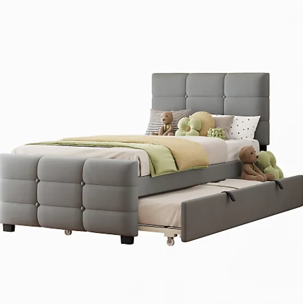 •【Design minimaliste classique】Ce lit enfant est doté d’une tête de lit rembourrée en mousse et d’un motif à rayures verticales classiques, lui conférant une allure simple et élégante qui s’harmonise parfaitement avec différents styles de chambre.•【Lit gigogne】Ce lit capitonné s’adapte facilement à vos besoins d’espace. En plus du lit principal (90 x 190 cm), un lit gigogne de 190 x 90 cm se trouve en dessous et peut être utilisé comme lit d’appoint.•【Tissu velours】Ce lit capitonné est confectionné en velours de haute qualité, un tissu délicat, doux au toucher, agréable pour la peau et respirant, pour un confort optimal. Le lit est disponible en beige et en gris.•【Robuste et stable】Ce lit enfant est doté d’une structure en bois et d’un sommier capitonné à lattes, supportant un poids maximal de 150 kg. De plus, ses pieds courts assurent une stabilité parfaite.•【Facile à assembler】Des instructions détaillées et des pièces complètes sont disponibles pour vous aider à réaliser l’assemblage rapidement.