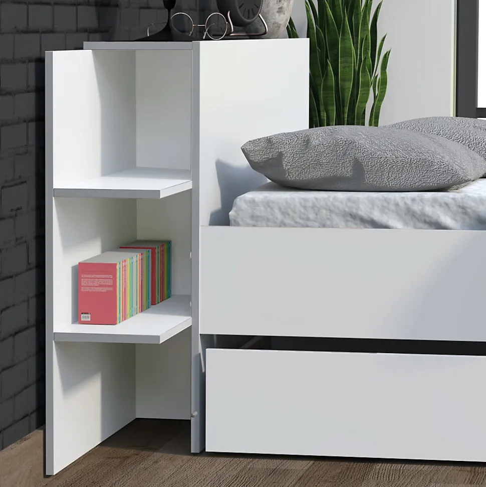 Lit CITY 140x190cm + tête de lit étagère chevet + 1 tiroir de rangementLe lit CITY vous offre un maximum d’espaces de rangement grâce à sa tête de lit étagère ainsi que son tiroir monté sur roulettes.Caractéristiques : Cadre: Structure en panneau de particulesFinition: blancDimensions intérieures du tiroir : 183x63x12 cmDimensions des niches de la tête de lit : 72x20x25 cmLivré démonté, sans sommier, sans matelas, prévoir un sommier à cadre. A monter soi-mêmeDimensions:216x216x80 cm