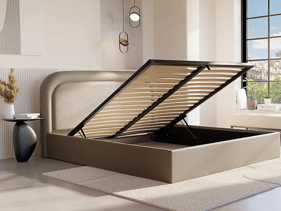 Avec son tissu tout doux et son design aux courbes arrondies, le lit FIREZA viendra créer un réel cocon dans votre chambre. Son petit plus, ce lit est équipé d’un coffre avec une grande capacité de rangement, idéal pour gagner de la place dans votre pièce ! 1 x Cadre de lit FIREZACaractéristiques Couleur (nuance) : Beige Matière (précision) : 100 % Polyester Structure : Bois, Panneau de particules Finition : Chiné Taille (couchage) : 140 x 190 cm Nombre de places : 2 places Garnissage : Mousse polyuréthane Densité (garnissage) : 25 kg/m³ Sans matelas Gamme : Made for design, Good for Planet, Création Exclusive Produit : Fabriqué en Europe Charge maximale supportée : 250 kg À monter soi-même : Ce lit est compatible avec tous les matelas 140×190 cmDimensions Longueur : 152 cm Hauteur : 90 cm Profondeur : 212 cm Hauteur de couchage : 31 cm Tête de lit : L152xP11xH90cm1 x Cadre à lattes ALANECaractéristiques Couleur (nuance) : Blanc Matière (précision) : Métal Epaisseur métal : 2 mm Taille (couchage) : 140 x 190 cm Nombre de places : 2 places Sans pieds Technologie (sommier) : Lattes actives Nombre de lattes : 32 lattes Matière des lattes : Bois (bouleau) Sens d’ouverture : Ouverture Verticale Gamme : Good for Planet Produit : Fabriqué en Europe Charge maximale supportée : 250 kg À monter soi-même : Corde permettant de lever facilement le sommierDimensions Longueur : 190 cm Hauteur : 8 cm Profondeur : 139 cm1 x Sommier coffre LOKIACaractéristiques Couleur (nuance) : Blanc Matière (précision) : HDF Taille (couchage) : 140 x 190 cm Nombre de places : 2 places Avec pieds, Sans pieds Gamme : Good for Planet Produit : Fabriqué en Europe Livré montéDimensions Longueur : 190 cm Hauteur : 0.5 cm Profondeur : 140 cmLivraisonLors de la livraison, il est conseillé de vérifier que le bon nombre de colis a été livré.Colis1 x Cadre de lit FIREZAColis n°1 : Longueur 154 cm, Largeur 87 cm, Hauteur 12 cm, Poids 26 kg. Colis n°2 :