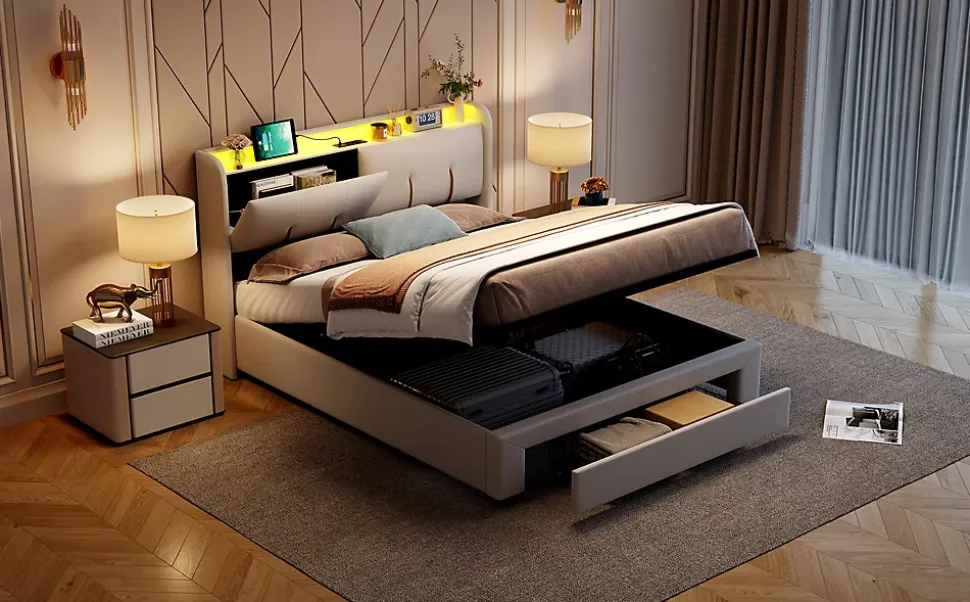 design luxueux: le lit est fabriqué en tissu de velours et dispose d’un large dossier rembourré, qui non seulement est élégant et rehausse l’effet décoratif de la chambre à coucher, mais offre également un excellent confort d’appui, ce qui est parfait pour lire ou regarder la télévision en s’appuyant sur la tête de lit. espace de rangement spacieux : équipé d’un système de levage hydraulique qui permet d’utiliser le dessous du lit comme espace de rangement, l’opération est simple et douce, facile d’accès à la literie, aux vêtements et autres articles, améliorant considérablement l’efficacité de l’utilisation de l’espace dans la chambre à coucher. qualité et durabilité : un matériau en velours doux et durable est utilisé, ainsi qu’un sommier métallique et en bois robuste avec une capacité de charge maximale de 300 kg, garantissant que le lit peut être utilisé pendant une longue période. des commodités modernes: tandis que la lumière led à couleur changeante réglable crée un environnement chaud et confortable, faisant de votre chambre à coucher un endroit plus accueillant et plus relaxant pour profiter d’une nuit de sommeil confortable. montage facile avec instructions claires : vous pouvez installer le lit rembourré grâce aux instructions claires. Si vous rencontrez des problèmes, veuillez contacter notre service clientèle, nous vous fournirons la meilleure solution dès que possible.description du produit lit coffre 140×200 avec sommier. avec rangement à levier pneumatique. matière en velours beige.