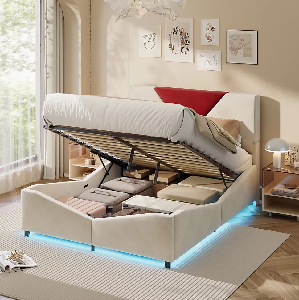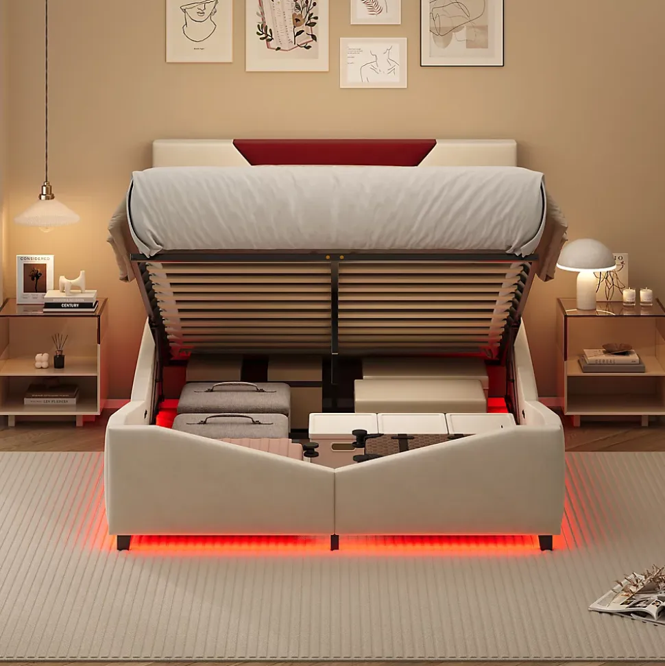 1. Grand espace de rangement, fini le désordre : Le lit dispose d’un espace de rangement à ouverture assistée par gaz, idéal pour ranger couvertures, vêtements ou articles saisonniers. Optimisez l’espace de votre chambre et maintenez-la ordonnée, même dans un petit appartement.2. Tête de lit bicolore, design élégant : La tête de lit présente un motif triangulaire en blanc cassé et rouge bordeaux, apportant une touche artistique et moderne à votre chambre. Elle s’adapte facilement aux styles contemporains ou luxe discret et devient le point focal visuel de la pièce.3. Structure de lit solide, grande capacité de charge : Fabriqué en bois de qualité et métal, avec un sommier à lattes scientifiquement conçu pour un soutien uniforme et robuste. Garantit stabilité et durabilité pour un sommeil en toute sérénité.4. Dossier rembourré confortable, soutien agréable : Les parties rembourrées de la tête et du corps du lit offrent une sensation douce et un bon soutien du dos, pour un confort optimal lors du repos ou de la lecture.5. Design de rangement pratique, accès facile : L’espace de rangement est conçu pour une ouverture aisée, permettant de prendre vos affaires sans effort. Organiser votre chambre devient simple et rapide.&Détails du produit&Taille : 140 x 190 cmCouleur : Blanc casséMatériau du produit : métal + MDFMatelas inclus : NonDimensions totales du produit : 207 x 149 x 125cmNombre de paquets : 2Capacité de poids : 500 kgNombre de lamelles : 12&Remarques&※ En raison de la mesure manuelle, un écart de 2 à 3 cm peut se produire.※ En raison de l’influence de la lumière du soleil et d’autres facteurs, il peut y avoir de légères différences de couleur.※ Ce produit sera expédié en 2 colis. Ils peuvent arriver à des moments différents. Veuillez patienter.
