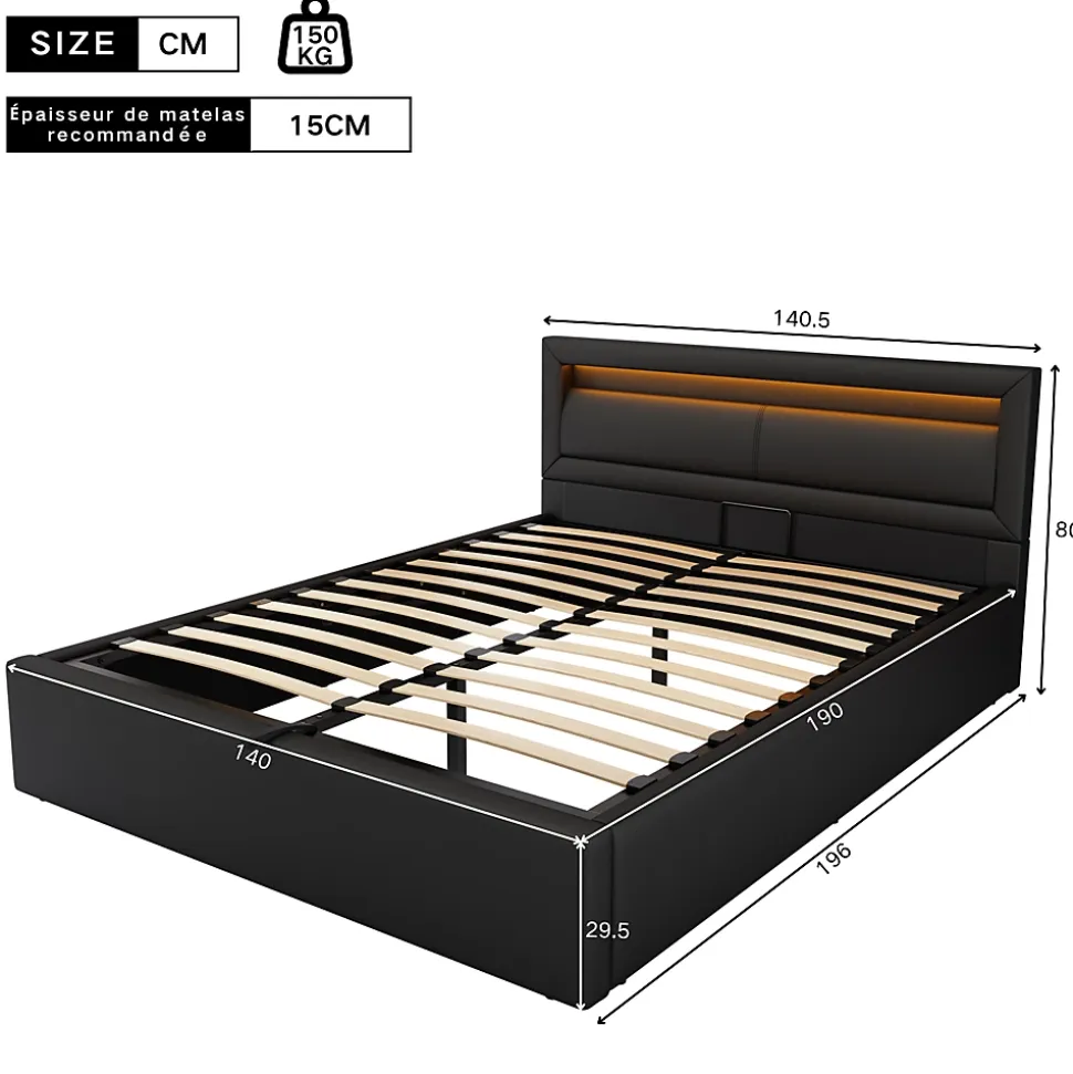 ▶ ▶ Détails ▶────────────────● Type de produit : Lit coffre● Matériau : PU + MDF● Couleur : Noir● Taille du lit : 140 × 190 cm● Sommier : Inclus● Matelas : Non inclus● Rangement : Coffre sous le sommier● Hauteur de la tête de lit : 80 cm● Charge maximale : 150 kg● Nombre de colis : 2► Remarques ►※ Ce produit est livré en 2 colis, les délais de livraison peuvent varier.※ Toutes les dimensions sont approximatives et peuvent légèrement varier.※ Il est recommandé d’avoir une deuxième personne pour le montage.※ Pour toute question pendant l’installation, veuillez contacter notre service client.