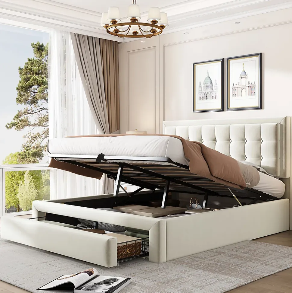 - 【Rangement Pratique et Efficace】 Ce lit est équipé d’un système de rangement puissant avec des barres hydrauliques et des tiroirs à mailles métalliques, permettant de stocker vos objets et de garder votre chambre propre et bien organisée tout en étant facile à nettoyer.