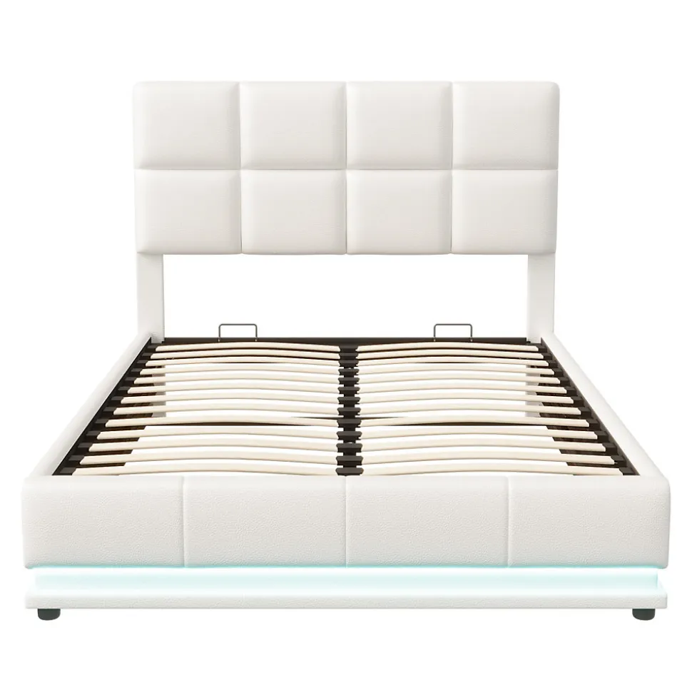 DescriptionIl est facile de rendre votre maison unique, ce lit rembourré en simili cuir avec barre lumineuse LED est digne de votre possession, le lit double 140x190cm est un bon choix qu’il soit utilisé dans la chambre principale ou la chambre d’amis. Ce lit est disponible en deux couleurs, blanc et gris, et les lumières LED ont 16 options de couleurs, vous offrant une nuit romantique et un sommeil confortable.Caractéristiques du produit: Lit moderne avec LED Décoré avec un design élégant en simili cuir, il y a de belles lumières LED autour du lit, actionnées par une télécommande à 24 touches, avec 4 modes de changement automatique et 16 couleurs de lumière changeantes. Lattes métalliques à haute capacité de charge et lattes à double rangée, la capacité de charge peut atteindre 300 kg, de sorte que le matelas ne s’affaisse pas facilement et crée un environnement de sommeil confortable pour vous. Durable : ce lit de rangement est doté d’un mécanisme de double levage hydraulique facile à utiliser et est fait de bons matériaux en cuir, y compris une poutre de support centrale robuste et un cadre rembourré. La tête de lit est réglable en hauteur et disponible en deux hauteurs de 91/101 cm. La hauteur de matelas recommandée est de 15 à 25 cm, vous pouvez donc choisir le matelas adapté à vos besoins.Spécification: Dimensions hors tout du produit : 195 x 141 x 115 cm Nombre de colis : 2 Poids total du produit : 52,8 kg Épaisseur de matelas recommandée : 15-25 cm Couleur : beige Matériau du produit : MDF + métal + cuir. Sommier tapissier requis : Non Matelas inclus : non Nombre de personnes recommandé : 2 Évitez les outils électriques : Oui