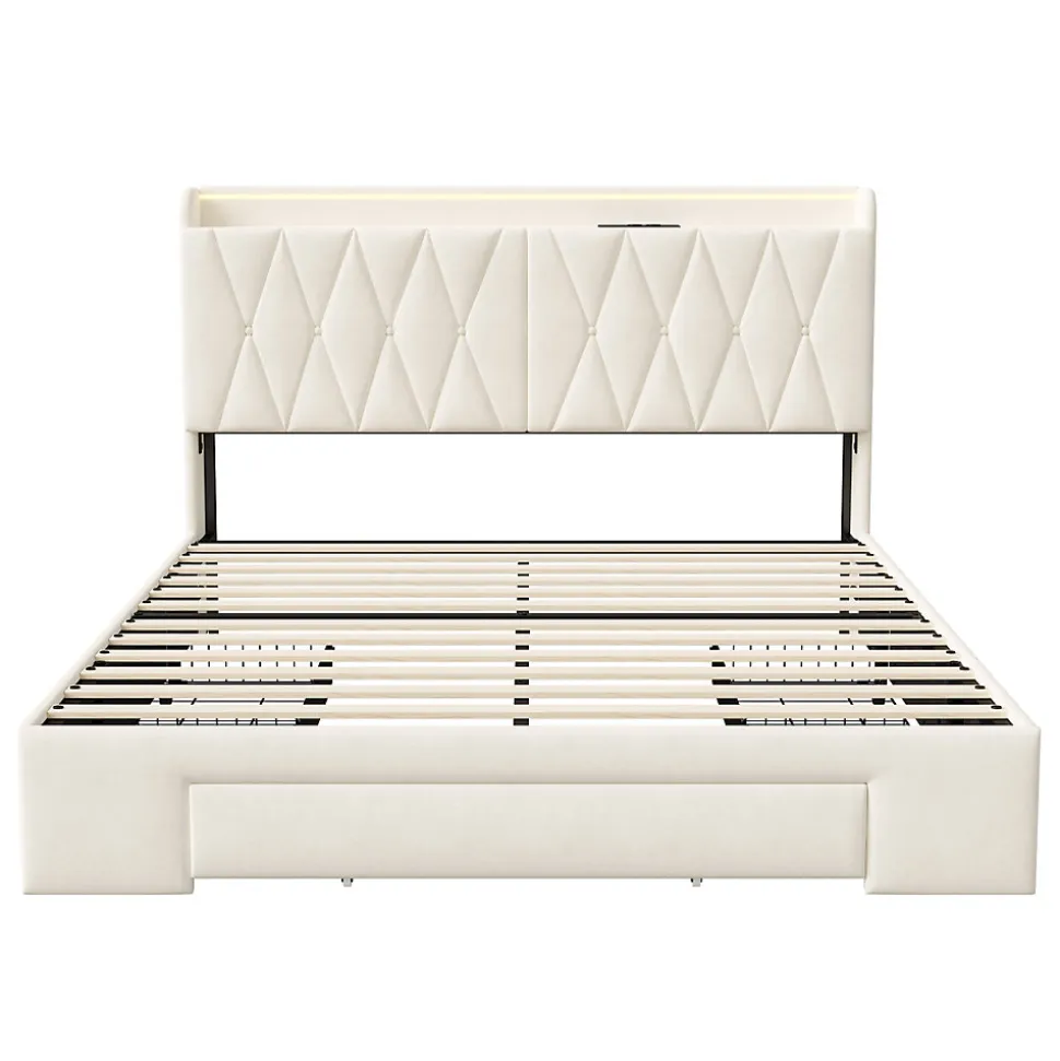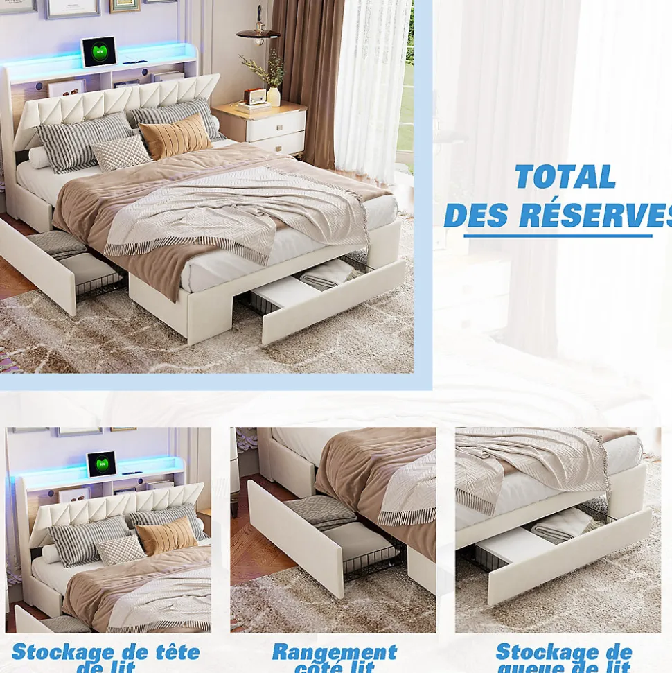 Design moderne et chaleureux Revêtu dun tissu teddy beige doux et moelleux, ce lit double allie élégance et confort. Sa texture agréable au toucher crée une atmosphère cosy et raffinée, idéale pour transformer votre chambre en un espace de détente. Grand espace de rangementSitués au pied du lit, les tiroirs intégrés offrent une capacité de rangement généreuse. Parfaits pour organiser votre linge de lit, vos oreillers, vos vêtements ou dautres objets du quotidien, ils permettent de garder votre chambre propre et bien ordonnée. Ports USB intégrésLa tête de lit est équipée de ports USB pratiques, vous permettant de recharger facilement vos téléphones, tablettes ou autres appareils électroniques. Fini les câbles encombrants ou les multiprises éloignées, tout est à portée de main. Confort et robustesseLa structure du lit associe bois et métal de haute qualité, assurant une stabilité optimale et une longue durée de vie. Le sommier est conçu pour offrir un bon soutien, garantissant des nuits paisibles et confortables. Polyvalent et facile à intégrerGrâce à son design épuré et sa couleur neutre, ce lit sharmonise facilement avec tous les styles de décoration : moderne, scandinave, minimaliste ou contemporain. Il constitue un choix idéal pour les chambres principales comme pour les chambres damis. Détails : Dimensions : 207 x 145 x 108cm, Matelas compatible : 140 x 190 cm (matelas non inclus). Ce lit sera expédié par lots. En raison de contraintes logistiques, il est possible que les livraisons ne soient pas simultanées. Merci de votre patience.