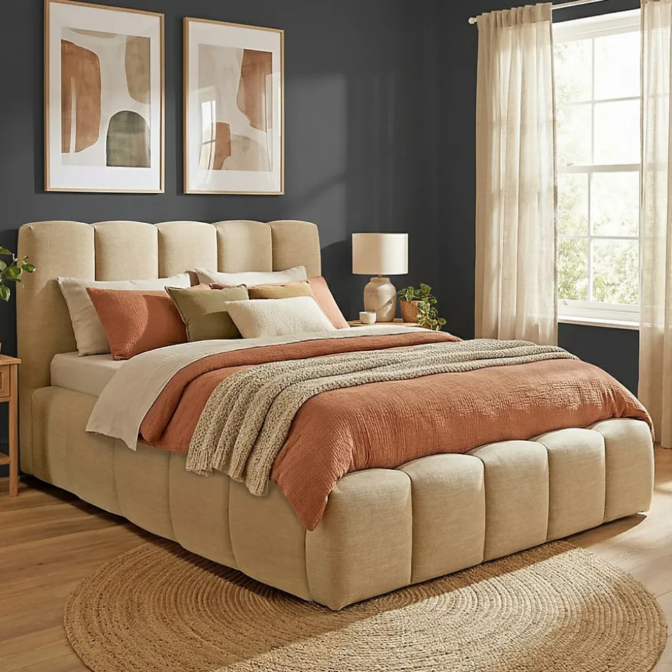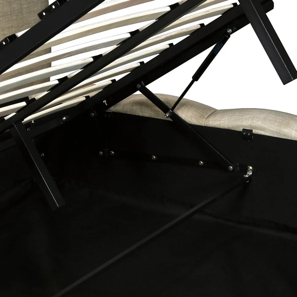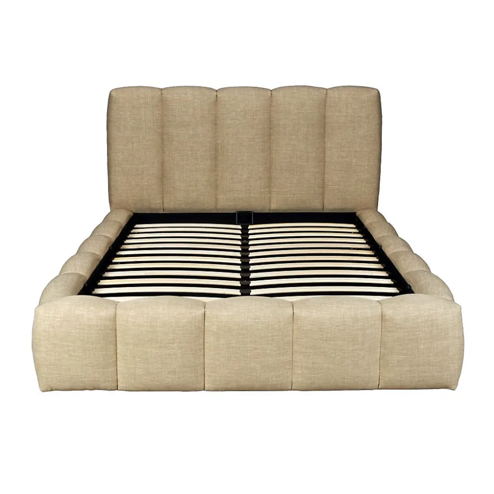 Lit coffre 140x190cm NEST + 1 sommier. Redéfinissez le confort et l’esthétique de votre chambre avec le lit NEST. Véritable pièce maîtresse, ce lit se distingue par son allure sculpturale et ses lignes généreuses qui invitent à la détente et au cocooning.Le lit NEST se démarque par son cadre de lit et sa tête de lit matelassés, composés de sections bombées qui créent un effet visuel de douceur et de volume. Ce revêtement texturé, aux finitions soignées, apporte une touche contemporaine et chaleureuse à votre intérieur, s’adaptant aussi bien aux décors minimalistes qu’aux ambiances plus feutrées.Ne choisissez plus entre style et praticité. Sous son sommier à lattes, le lit NEST cache un vaste coffre de rangement. Idéal pour optimiser l’espace, il vous permet de stocker couettes, oreillers et linge de maison en toute discrétion, tout en les gardant à portée de main.Les Plus Produits : – Confort visuel et tactile : Une structure entièrement capitonnée pour un rendu « nuage » ultra-tendance.- Mécanisme performant : Système d’ouverture par vérins pour une manipulation fluide et sans effort.- Qualité de couchage : Sommier à lattes robustes inclus, garantissant un excellent maintien de votre matelas.- Gain de place : Un espace de stockage spacieux sur toute la surface du lit.Caractéristiques techniques : – Dimension couchage : 140×190 cm.- Revêtement : Tissu texturé en lin (coloris beige naturel).- Structure : Bois et métal.- Sommier : Relevable, cadre métallique et lattes en multiplis.- Pieds plastique.- Dimensions hors tout (LxPxH) : 222x171x114cm. – Dimensions coffre (LxPxH) : 194x141x25cm – 683 litres.- Poids maximum du matelas conseillé : 30 kg.Livré démonté, sans accessoires. A monter soi-même. Dimensions:222x171x114