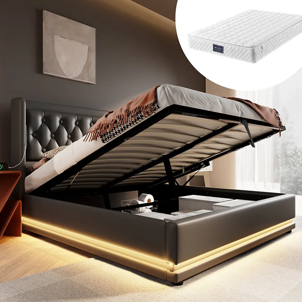 - 【Rangement Sous le Lit Innovant】 Le lit est conçu avec un mécanisme de levage hydraulique de haute qualité, offrant un espace de stockage spacieux sous le lit. Vous pouvez y ranger vos affaires tout en protégeant vos objets de la poussière grâce à la base recouverte de tissu.