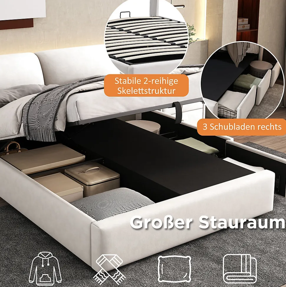 - 【Grand espace de rangement】 Trois tiroirs intégrés et un large coffre sous le lit offrent un espace optimal pour ranger linge de lit, vêtements ou objets personnels, permettant de maintenir la chambre organisée et fonctionnelle.