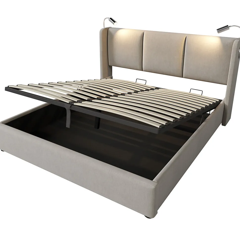 ▶ ▶ Détails ▶────────────────● Dimensions : 206 x 165 x 107 cm (L x l x H)● Surface de couchage : 160 x 200 cm (Sans matelas)● Matériaux : Bois massif + PU + Métal● Couleur : Beige● Capacité de poids : 660 lbs (299,37 kg)● Poids net / brut : 43 kg / 45,88 kg● Espace de rangement interne : 193 x 133 cm● Pièces incluses : Cadre de lit, Sommier, Lampe de lecture avec fonction de charge USB● Nombre de colis : 2► Remarques ►※ Ce produit est expédié en 2 colis, qui peuvent arriver à des jours différents. Veuillez patienter jusqu’à la réception des deux colis.※ En raison de mesures manuelles, un écart de 2-3 cm peut se produire.※ En raison de l’éclairage, des différences de couleur peuvent exister entre l’image du produit et le produit réel. Veuillez vous référer au produit reçu.※ Si vous avez des questions lors de l’installation, veuillez nous contacter dès que possible.