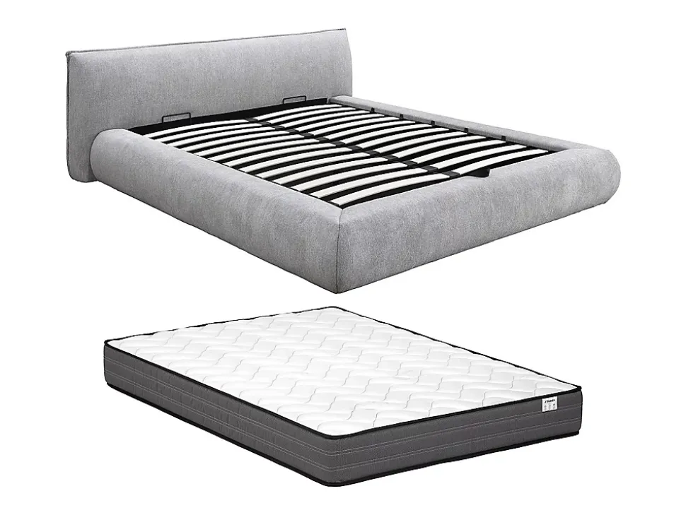 Découvrez l’alliance parfaite entre design contemporain et fonctionnalité avec ce lit coffre élégant. Son volume de rangement spacieux vous permet de garder votre chambre ordonnée sans sacrifier le style. Une pièce maîtresse moderne qui sublime votre espace nuit. Adoptez MIRSIO sans hésiter !1 x Lit coffre MIRSIOCaractéristiques Couleur (nuance) : Gris clair Matière (précision) : 100 % Polyester Structure : Bois, MDF, Contreplaqué Taille (couchage) : 160 x 200 cm Nombre de places : 2 places Garnissage : Mousse polyuréthane Densité (garnissage) : 20 kg/m³ Avec sommier Type de sommier : Cadre à lattes Nombre de lattes : 26 lattes Matière des lattes : Bois (peuplier) Gamme : Good for Planet Charge maximale supportée : 230 kg À monter soi-même : Ce lit est compatible avec tous les matelas 160 x 200 cmDimensions Longueur : 216 cm Hauteur : 81 cm Profondeur : 244.5 cm Hauteur de couchage : 31.5 cm Coffre : L160 x P200 x H30 cm1 x Matelas classique AMBRACIECaractéristiques Technologie (âme) : Ressorts ensachés Nombre de ressorts (matelas) : 580 Soutien : Equilibré Technologie matelas (accueil) : Mousse de confort Densité (accueil) : 23 kg/m³ Accueil : Tonique Garnissage du matelas : Fibres de polyester Coutil (matière) : Coutil stretch Couleur (nuance) : Blanc Matière (précision) : 100 % Polyester Taille (couchage) : 160 x 200 cm Nombre de places : 2 places Indépendance de couchage : Indépendance de couchage Réversible été/hiver, Carénage Gamme : Good for Planet Produit : Fabriqué en Europe Compressé/roulé : Compressé/rouléDimensions Longueur : 200 cm Hauteur : 20 cm Profondeur : 160 cm Epaisseur matelas : 20 cm Hauteur de l’âme : 15 cmLivraisonLors de la livraison, il est conseillé de vérifier que le bon nombre de colis a été livré.Colis1 x Lit coffre MIRSIOColis n°1 : Longueur 222 cm, Largeur 87 cm, Hauteur 29 cm, Poids 33 kg. Colis n°2 : Longueur 225 cm, Largeur 65 cm, Hauteur 35 cm, Poids 54 kg. Colis n°3 : Longueur 203 cm, Largeur 29 cm,