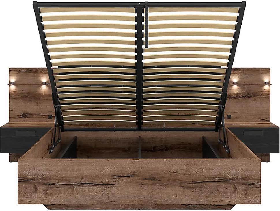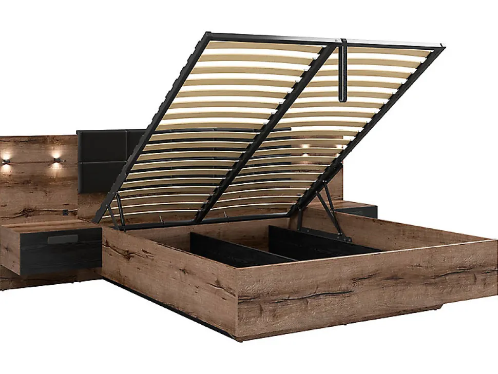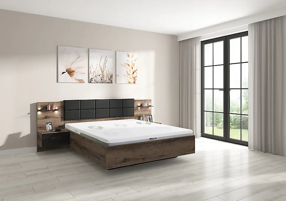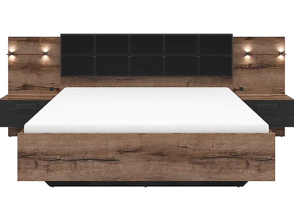Large lit double 160 x 200 cm avec des tables de chevet intégrées dotées d’éclairage LED activable par simple pression sur un écran tactile doté d’un tiroir pratique, offrent un espace de rangement pour vos petits objets. La tête de lit, revêtue de similicuir noir matelassé, apporte une touche d’élégance au mobilier. Ce modèle moderne est équipé de ports USB , vous permettant ainsi de connecter votre téléphone à un chargeur et de l’avoir à portée de main.Dimension: Longueur 206 x Profondeur 165-265 x Hauteur 42-98,5 cm Structures : panneaux de particules, bois (lattes et insert pour le lit), film décoratif, chant en plastiqueFaçade : panneaux de particules, film décoratif, chant en plastique/chant simpleAccessoires : Composant de roulement TOP-LINE, charnières SLIDE-ON ’90 Alfa FGV avec frein, guides Quadro, poignées en plastique (noir mat), cadre en métal.Autres : appui-tête rembourré (en similicuir noir mat), éclairage, double connecteur USB.Matelas non inclusPoids : 156 kg