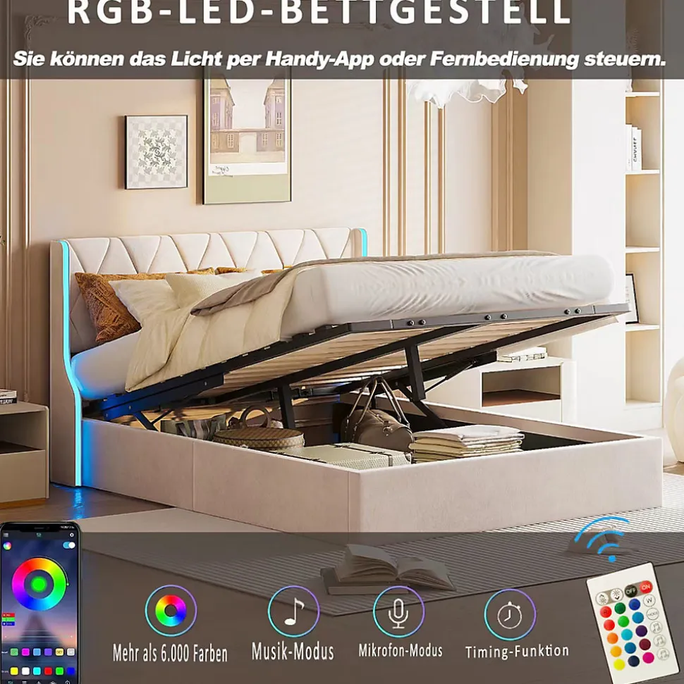 it coffre avec ledVous pouvez utiliser la télécommande ou le téléphone portable inclus pour régler la couleur et le mode de la lumière. Contrairement aux lumières LED traditionnelles, les lumières LED de ce lit hydraulique peuvent changer au rythme de la musique, créant une variété d’atmosphères différentes pour votre chambre.lit 2 personne avec sommierLa surface du lit coffre est en tissu velours doux, agréable au toucher et doux pour la peau. L’aspect beige est élégant et ajoute une atmosphère chaleureuse à votre maison.lit 160×200 avec sommierLa fonction la plus pratique de ce lit double est l’espace de rangement sous le lit. Il adopte une conception à tige pneumatique pour soulever facilement la surface du lit, ce qui facilite le rangement, vous aidant à garder la pièce bien rangée et vous permettant d’économiser de l’espace. au milieu Les pieds offrent un soutien supplémentaire au lit, rendant l’ensemble du lit plus stable et solide, créant ainsi un bon environnement de sommeil pour vous.lit adultelit coffre 160x200Détails du produit :- Matériau : velours + bois + métal.- Dimensions (l x p x h) : 213 x 169 x 105 cm.- Poids : 49 kg.- Charge maximale : 300 kg.- Surface de couchage de 160 x 200 cm (sans matelas).- Nombre de lamelles : 12.Remarques :- Et l’ensemble du produit est livré en 2 paquets et peut arriver à des jours différents. Veuillez être patient pour la livraison complète.- Les coussins, les couvertures et les objets de décoration représentés sur la photo ne sont pas inclusContenu de l’emballage :1 lit de 2 place1 mode d’emploi (français non garanti)