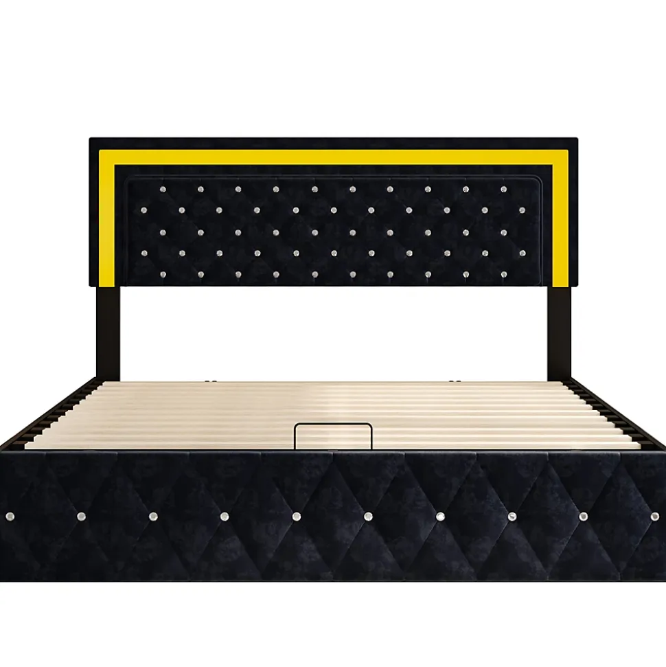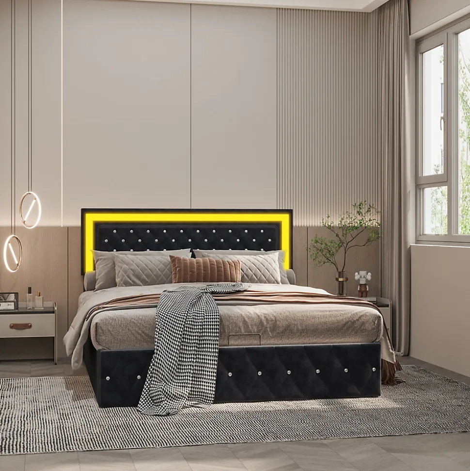 design de stylela tête de lit réglable (106-112) vous offre un soutien plus stable et plus confortable de la tête et du dos. Le lit rembourré est fabriqué en velours, qui est doux pour la peau et vous offre une expérience de sommeil parfaite. Le gris rend le lit moelleux plus résistant aux salissures.apparence exquiseavec sa construction robuste et son design élégant avec son motif à boutons, sa tête de lit et ses ornements, il est résistant et confère une atmosphère raffinée à votre chambre à coucher.cadre de lit hydrauliquele design du levier hydraulique vous permet de soulever facilement la surface du lit et de placer des objets dans le cadre de lit. Le coffre de lit est revêtu d’un non-tissé noir qui repousse l’humidité et garantit que les objets stockés sous le lit restent propres. Les ressorts d’arrêt à l’extrémité du lit facilitent le soulèvement du sommier et contribuent également à la fixation du matelas.ambiance sensuellecontrôlez facilement les lumières du cadre de lit led à l’aide de la télécommande fournie ou de la commande smart wireless. Plongez dans la douce lueur des lumières led intégrées, qui ajoutent de l’élégance et créent une atmosphère paisible dans la chambre à coucher. Réjouissez-vous du plaisir visuel que les lumières créent dans votre chambre.instructions de montageune installation est nécessaire. Le produit fourni contient des instructions détaillées et les outils de montage nécessaires. données techniquestaille : 141x204x106-112cmtype de sommier : un sommier à lattes est inclus dans la livraison.type de matelas : sans matelasdétails des espaces de rangement : espace de rangement sous le litlargeur du plan de couchage : 160 cmlongueur du plan de couchage : 200 cmpoids : 55 kgcontenu de la livraison :- 1 x lit rembourré led- 1 x instructions