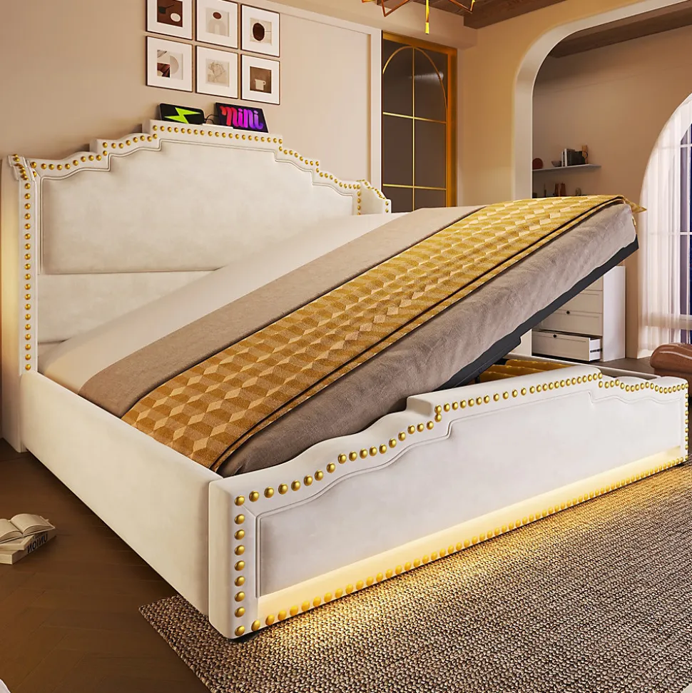 Design & styleCe lit coffre présente un revêtement en velours beige au toucher doux, avec une têtière et un pied ornés de clous artisanaux pour une allure soignée. Les ailes latérales de 21 cm et la têtière pleine hauteur offrent une finition enveloppante et limitent l’entrée de poussière, tout en s’intégrant dans un intérieur contemporain.Fonction coffre & ouverture Système hydraulique offrant un accès facile à un grand volume de rangement pour couettes et vêtements saisonniers. Montage réversible gauche/droite pour s’adapter à l’agencement de la chambre. Bandes métalliques sur les côtés et sangle d’élévation pour sécuriser et faciliter la manipulation du matelas.Éclairage & connectivitéBande LED intégrée, commandable par application ou télécommande avec plus de 60 000 couleurs et mode musique pour créer différentes ambiances. Têtière équipée de ports USB et Type‑C pour recharger facilement vos appareils au chevet.Matériaux & soliditéStructure combinant métal, bois massif et lattes solides, maintenue par pieds métalliques pour une bonne capacité de charge (charge utilisateur recommandée jusqu’à 200 kg). Le design encastré du cadre et la hauteur du pied (44 cm) limitent le glissement du matelas pour un sommeil stable.Montage & livraisonProduit livré en 3 colis (dimensions totales 170x213x120 cm) afin de réduire les risques de transport; les colis peuvent arriver séparément. Matelas non inclus, lit compatible 160×200 cm (épaisseur de matelas recommandée 25 cm). Pièces étiquetées, notice claire et outil simple fournis; montage requis, deux personnes conseillées.