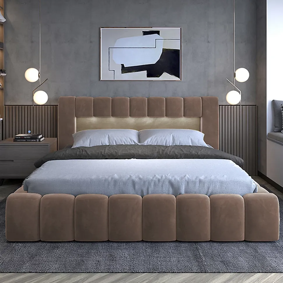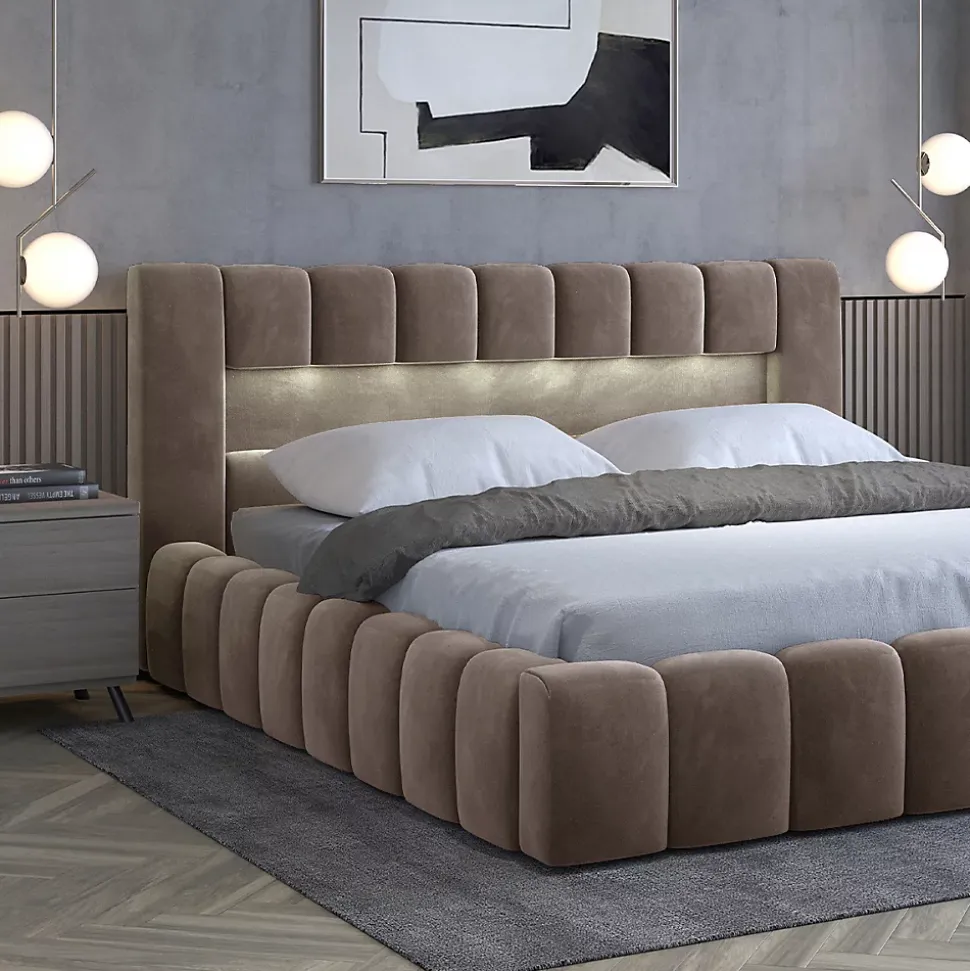 - Caractéristiques : Sommier coffre Inclus – Vérin à gaz avec amortisseur – 1 grand coffre de rangement divisé en 2 compartiments – Niche avec 1 bande LED à brancher sur prise secteur – 1 télécommande pour allumer et éteindre – Poids maximum conseillé : 200 kg – Matelas Non inclus – Hauteur matelas conseillé : 20 à 25 cm – Existe en 2 tailles : 160×200 cm et 180×200 cm – Existe en 3 coloris : Marron clair, Gris foncé et Gris