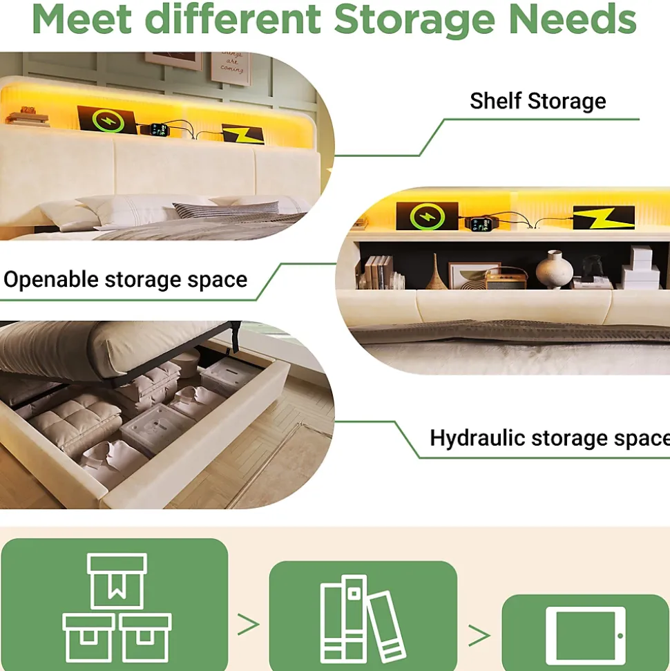 - 【Rangement généreux】 Le mécanisme hydraulique au pied facilite l’accès à un espace de rangement sous le lit pour couvertures et objets peu utilisés, tandis que le rangement dans la tête de lit accueille livres, tablettes et autres effets quotidiens.
