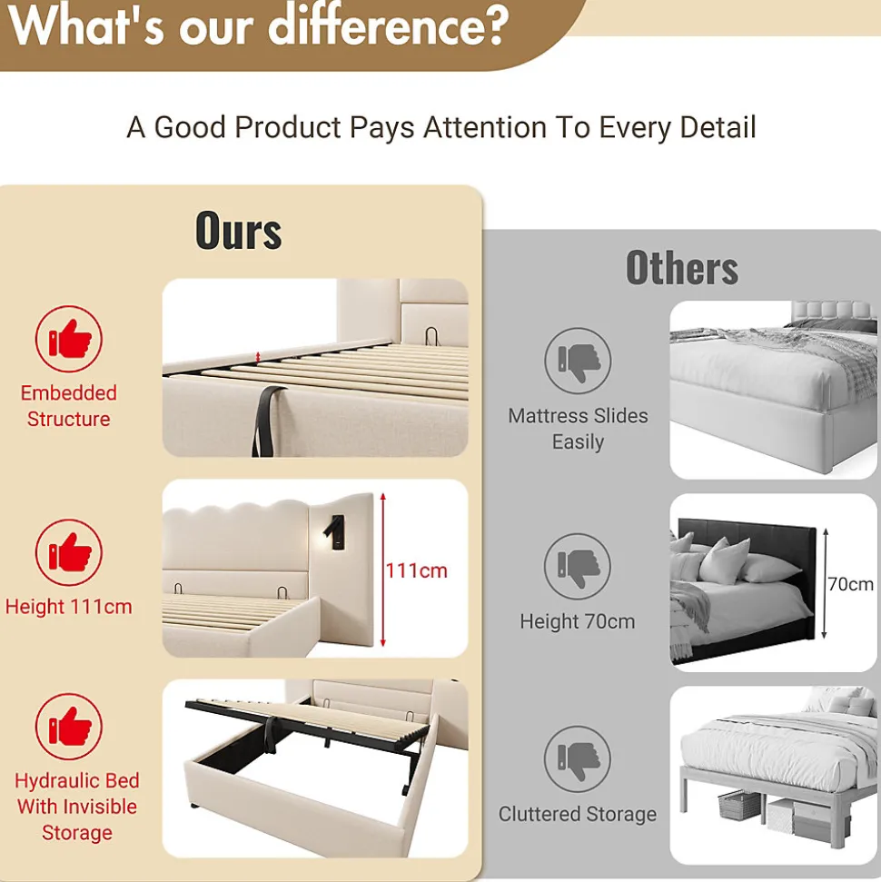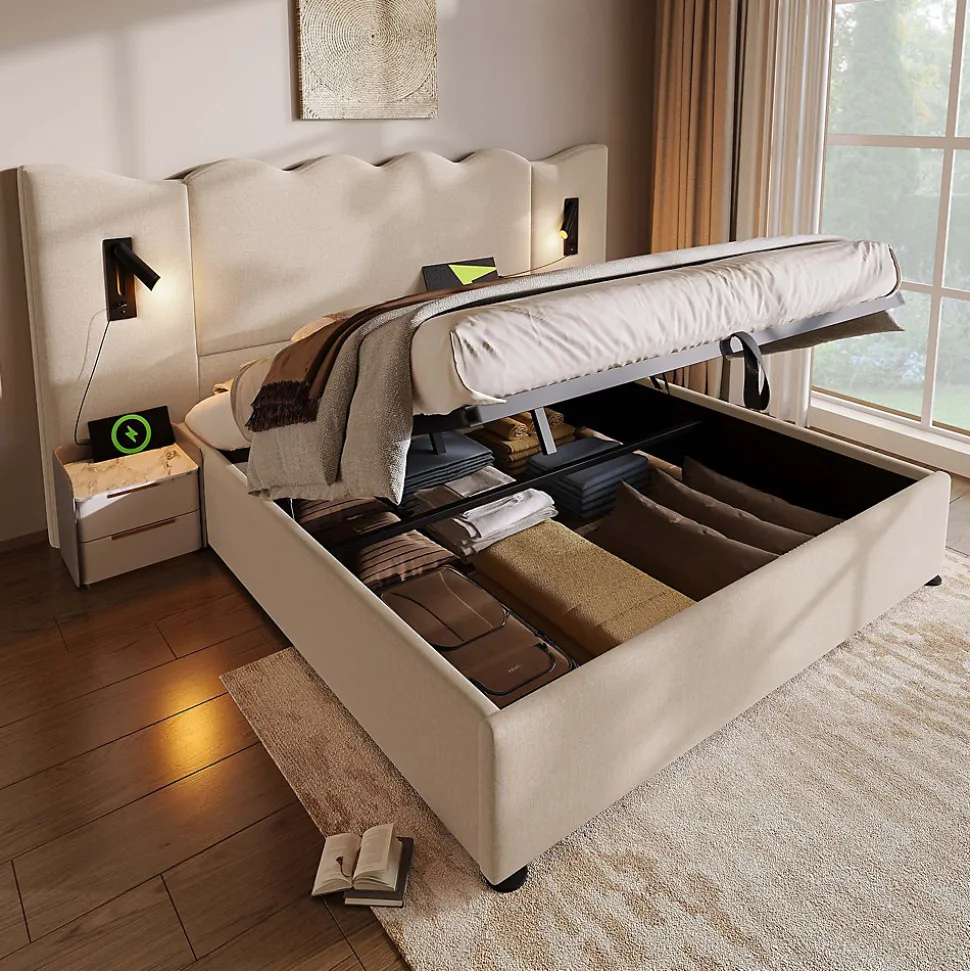 - 【Confort et fonctionnalité combinés】 L’association du design ondulé, de la lampe intégrée et du rangement hydraulique rend le lit élégant et pratique, améliorant l’expérience de sommeil et l’organisation de votre chambre.