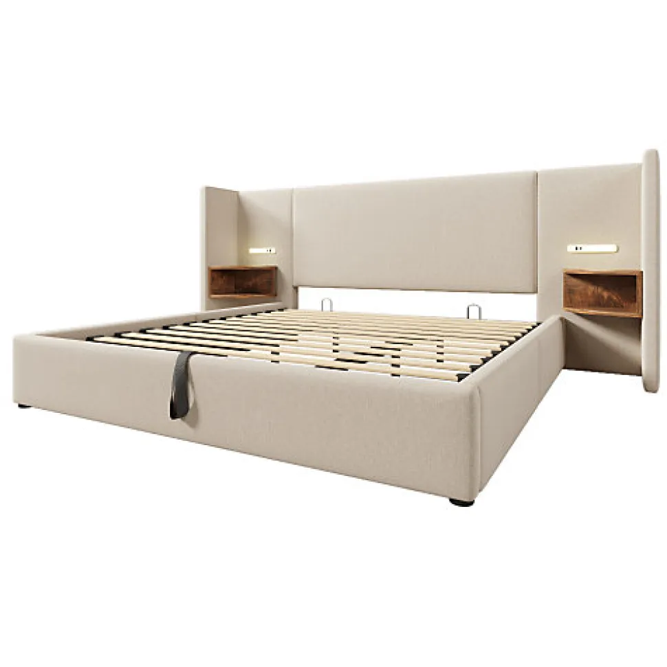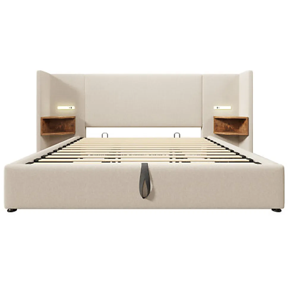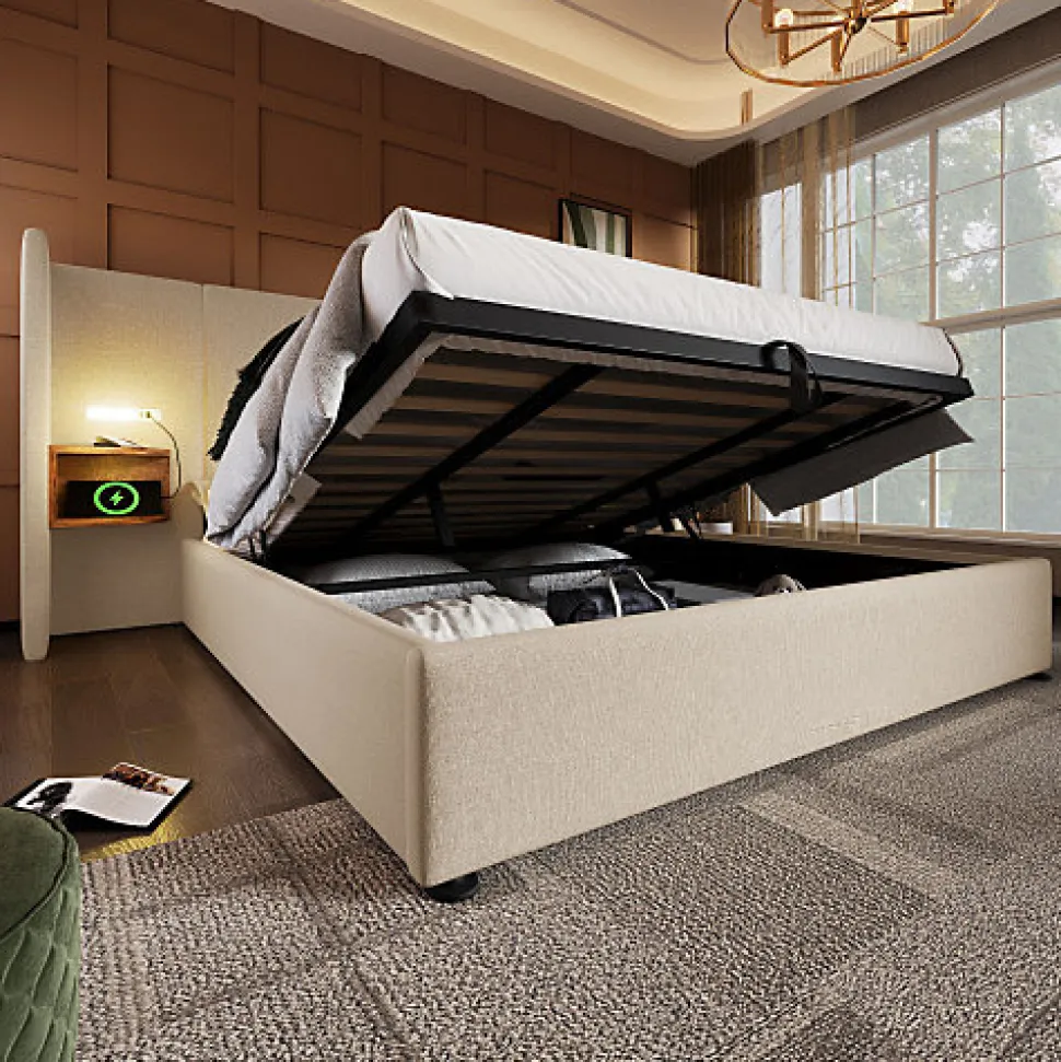 •【Conception de chevet multifonctionnelle】Le design de la tête de lit de 31 cm de large est à la fois beau et fonctionnel. Il est livré avec 2 étagères en bois pouvant contenir des livres, des chargeurs, des téléphones portables et d’autres petits objets pour garder votre table de chevet propre et organisée.•【Lampe de lecture rechargeable】La lampe de lecture sur la tête de lit a une fonction de luminosité réglable au toucher, et la lumière est douce et suffisante. Il est également équipé d’une interface USB et d’une interface Type-C, qui peuvent charger des smartphones, tablettes et autres appareils, offrant une expérience d’utilisation plus intelligente et plus pratique.•【Lit de stockage hydraulique】Le cadre de lit est équipé de vérins hydrauliques de haute qualité et présente une conception de sangle à l’extrémité du lit, ce qui facilite le levage et l’abaissement.•【Structure stable】Le cadre de lit est composé d’un cadre en métal et de lattes en bois massif. La base est équipée de pieds de support en métal pour augmenter encore la stabilité du cadre de lit. La conception encastrée du cadre de lit et les barres métalliques sur la tête de lit empêchent le matelas de glisser, garantissant ainsi une utilisation stable et confortable.