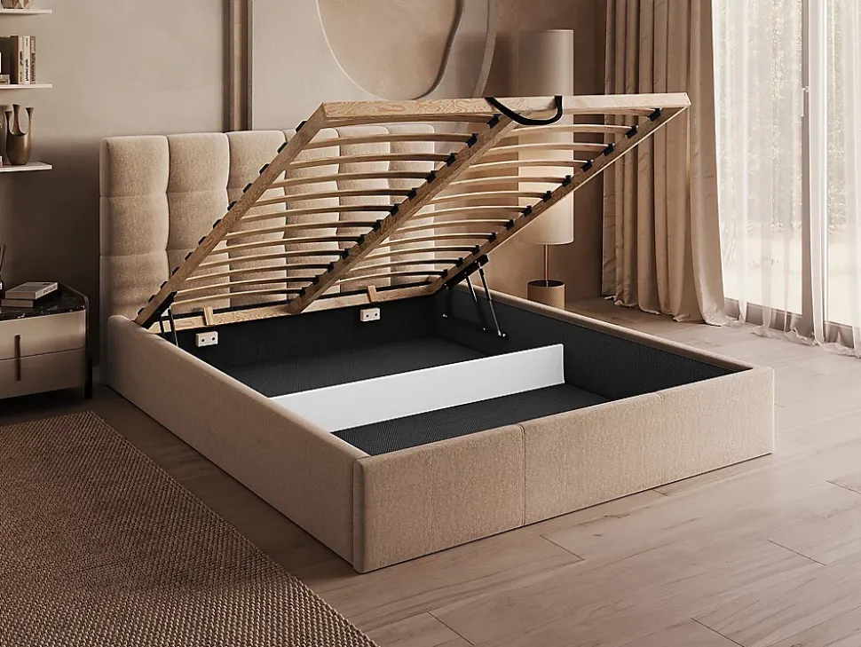 Optimisez votre espace avec élégance grâce au lit coffre MIRDAL au style contemporain et au coloris apaisant. Sa conception astucieuse vous offre 2 espaces de rangements sous le sommier afin de créer la chambre astucieuse vos rêves. Caractéristiques Couleur (nuance) : Beige Matière (précision) : 100 % Polyester, Velours Structure : Bois, Panneau de particules, MDF Taille (couchage) : 200 x 200 cm Nombre de places : 2 places Garnissage : Mousse polyuréthane Densité (garnissage) : 23 kg/m³ Sans matelas Avec sommier Type de sommier : Cadre à lattes Nombre de lattes : 24 lattes Gamme : Good for Planet Produit : Fabriqué en Europe Charge maximale supportée : 180 kg À monter soi-même : Sommier en contreplaqué : Coffre séparé en 2 parties : Ce lit est compatible avec tous les matelas 200 x 200 cmDimensions Longueur : 210 cm Hauteur : 106 cm Profondeur : 213 cm Hauteur de couchage : 29 cm Coffre 1 : L201 x P100 x H14 cm Coffre 2 : L201 x P100 x H14 cmLivraisonLors de la livraison, il est conseillé de vérifier que le bon nombre de colis a été livré.ColisColis n°1 : Longueur 213 cm, Largeur 110 cm, Hauteur 10 cm, Poids 30 kg. Colis n°2 : Longueur 205 cm, Largeur 31 cm, Hauteur 19 cm, Poids 33 kg. Colis n°3 : Longueur 202 cm, Largeur 26 cm, Hauteur 12 cm, Poids 16 kg.