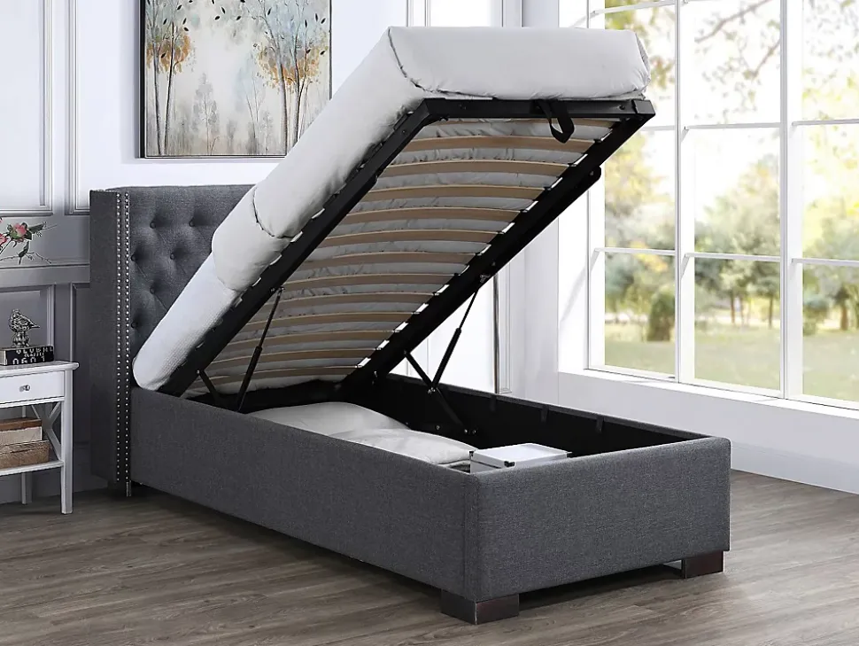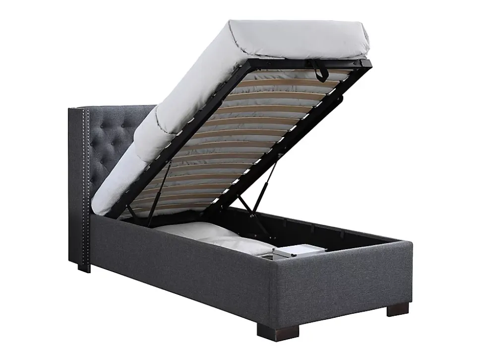 - Lit coffre 90 x 200 cm – Structure : MDF, contreplaqué et bois et – Revêtement : Tissu – Coloris : Gris – Dimensions : L214,5 x P107,5 x H111 cm – Style : romantique- Esthétique et confortable, le lit MASSIMO II promet de douces nuits avec style !