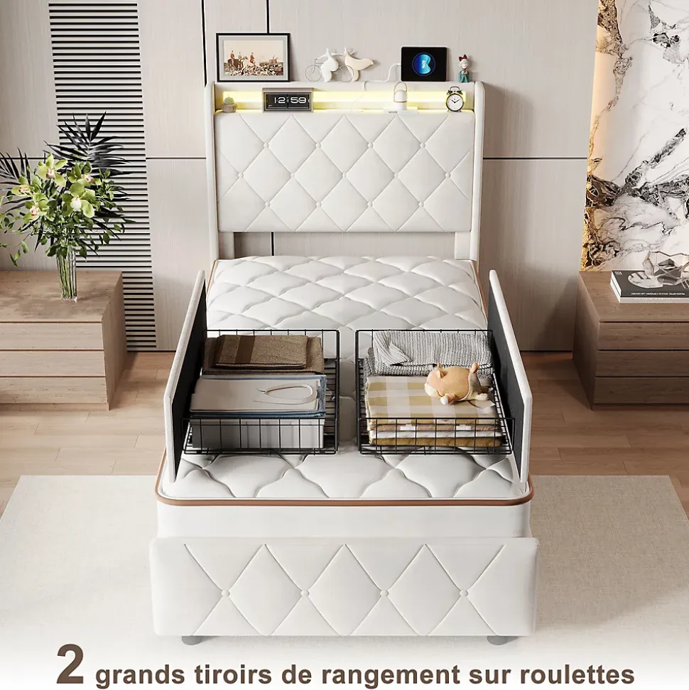 Design moderne et élégantCe lit en velours beige séduit par son style contemporain et raffiné. Sa tête de lit capitonnée avec éclairage LED intégré apporte une ambiance chaleureuse et personnalisable à votre chambre.Espace de rangement optimiséDoté de deux tiroirs spacieux sur roulettes au pied du lit, il offre un rangement pratique pour le linge de lit, les vêtements ou les objets du quotidien, idéal pour maximiser l’espace dans les petites chambres.Confort supérieurLa tête de lit et les côtés rembourrés en velours doux procurent une sensation agréable au toucher. Le dossier légèrement incliné assure un excellent confort pour lire, regarder un film ou se détendre.Tête de lit multifonctionnelleIntègre des ports USB pour recharger facilement vos appareils électroniques, ainsi que plusieurs compartiments latéraux pour ranger vos livres, lunettes ou objets décoratifs à portée de main.Livraison en deux colisPour minimiser les risques de dommages, le lit est expédié en deux colis séparés, pouvant arriver à des dates différentes. Pour toute question, notre service client est à votre disposition avec plaisir.Spécifications du produit Dimensions hors tout : 201 x 95 x 114 cm Dimensions du matelas compatibles : 90 x 200 cm Épaisseur de matelas recommandée : 15 à 25 cm Charge maximale supportée : 300 kg Matériaux : Velours Quantité par colis : 2