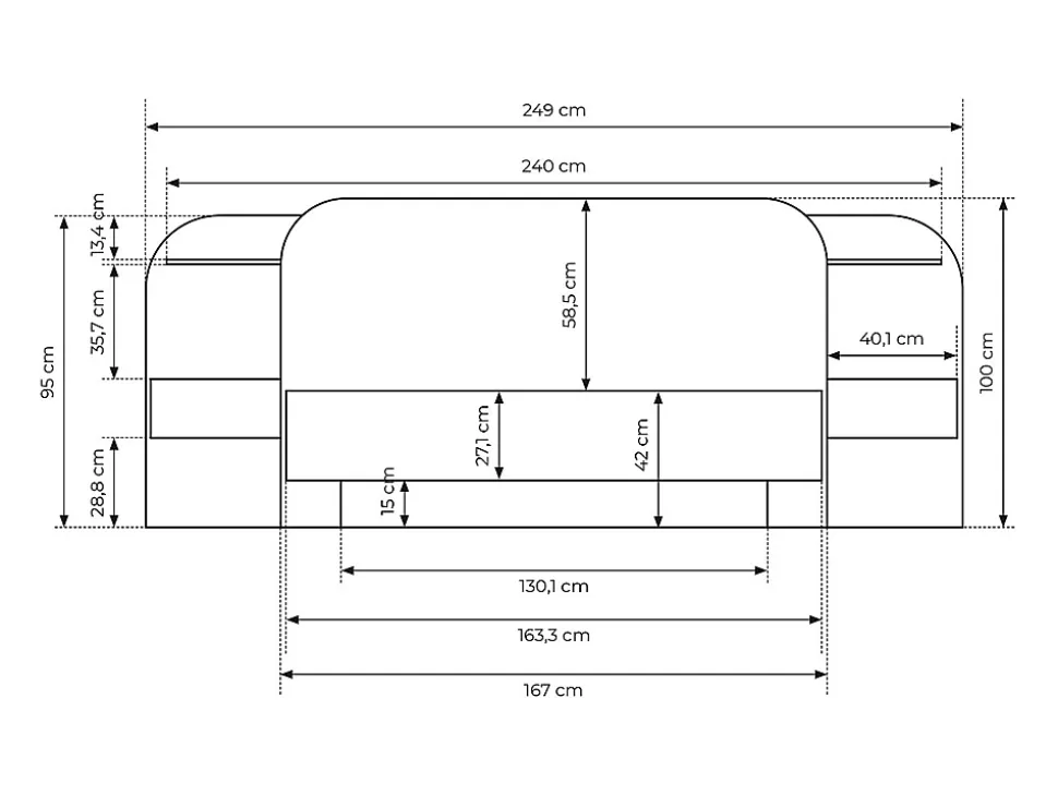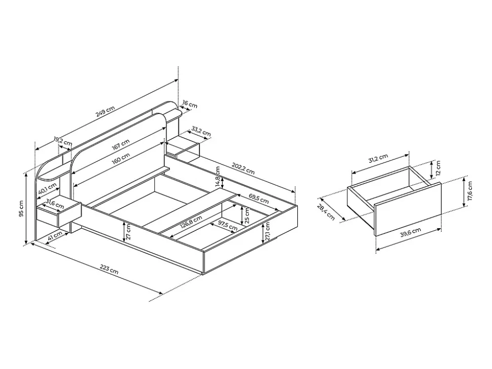 Transformez votre espace pour plus de confort et de raffinement en choisissant le lit JUVISIA, qui allie à la perfection l’utile à l’agréable. Son astucieux système de rangement, avec ses tables de chevet intégrés et ses tablettes, simplifie l’organisation de vos effets personnels.1 x Cadre de lit JUVISIACaractéristiques Couleur (nuance) : Naturel clair, Noir Matière (précision) : Panneau de particule Finition : Mélaminé Taille (couchage) : 160 x 200 cm Nombre de places : 2 places Avec leds Couleur des LEDs : Blanc Type de commande : Interrupteur Type de branchement : Prise secteur Sans matelas Avec chevet Type de rangement : 2 tiroirs, Tablette 2 tablettes Tiroir coulissant Produit : Fabriqué en Europe À monter soi-même Puissance LEDs : 12V Charge maximale d’un tiroir : 2 kg Charge maximale d’une tablette : 2 kg Charge maximale d’un chevet : 2 kg : Ce lit est compatible avec tous les matelas et sommiers de 160×200 cmDimensions Longueur : 249 cm Hauteur : 95 cm Profondeur : 223 cm Hauteur de couchage : 42 cm1 x Cadre à lattes ALANECaractéristiques Couleur (nuance) : Blanc Matière (précision) : Métal Epaisseur métal : 2 mm Taille (couchage) : 160 x 200 cm Nombre de places : 2 places Sans pieds Technologie (sommier) : Lattes actives Nombre de lattes : 34 lattes Matière des lattes : Bois (bouleau) Sens d’ouverture : Ouverture Verticale Gamme : Good for Planet Produit : Fabriqué en Europe Charge maximale supportée : 250 kg À monter soi-même : Corde permettant de lever facilement le sommierDimensions Longueur : 200 cm Hauteur : 8 cm Profondeur : 159 cmLivraisonLors de la livraison, il est conseillé de vérifier que le bon nombre de colis a été livré.Colis1 x Cadre de lit JUVISIAColis n°1 : Longueur 179 cm, Largeur 107 cm, Hauteur 6 cm, Poids 52 kg. Colis n°2 : Longueur 214 cm, Largeur 34 cm, Hauteur 14 cm, Poids 45 kg. 1 x Cadre à lattes ALANEColis n°1 : Longueur 205